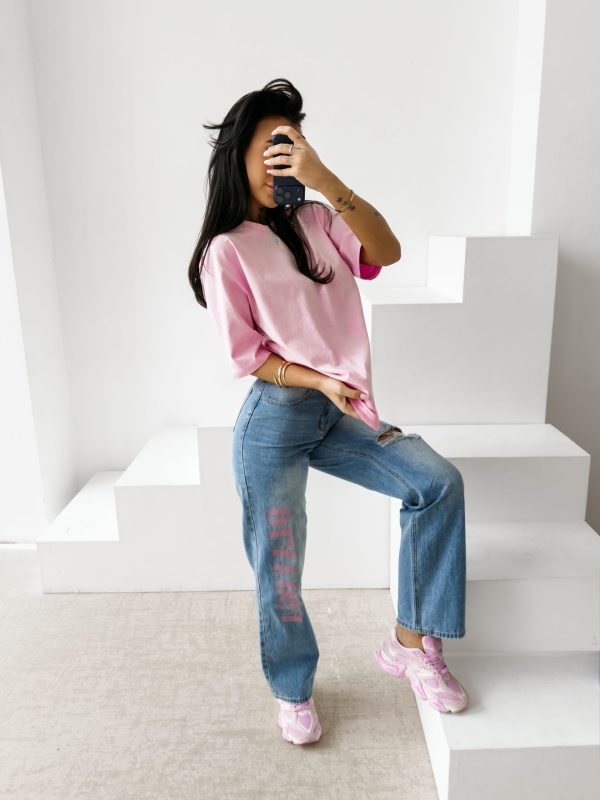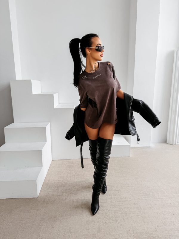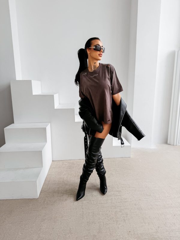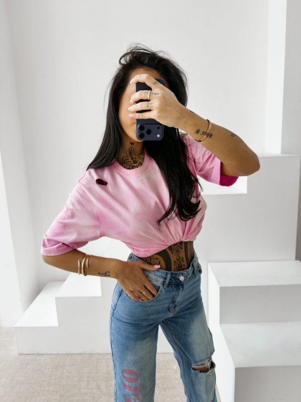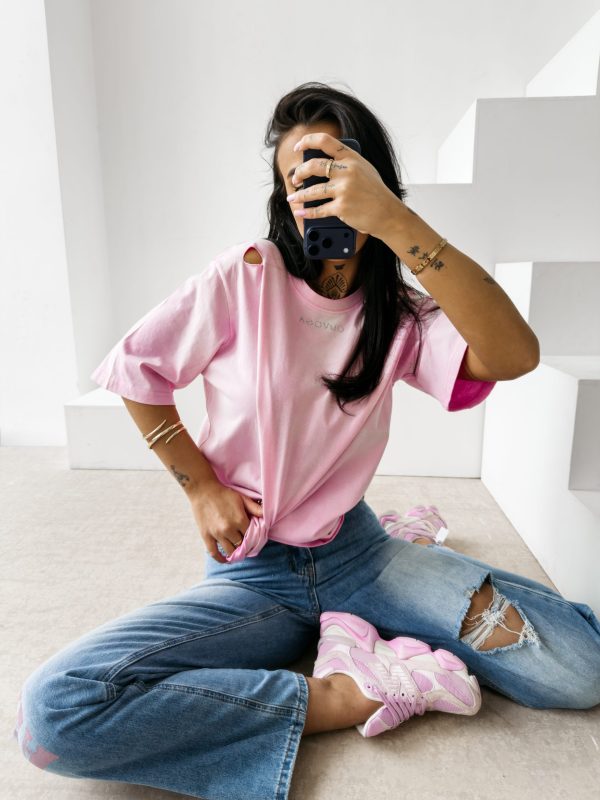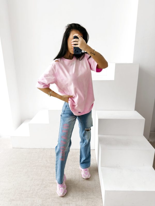 Oversiz’owy t-shirt o dłuższym kroju. Wykonany z miękkiej, przyjemnej w dotyku bawełny o delikatnie spranym efekcie. Model z wydłużoną linią, krótkim rękawem oraz klasycznym, okrągłym dekoltem. Na przodzie subtelne logo marki OLAVOGA. Produkt zdobią dekoracyjne przetarcia oraz metaliczne aplikacje przy ramionach.