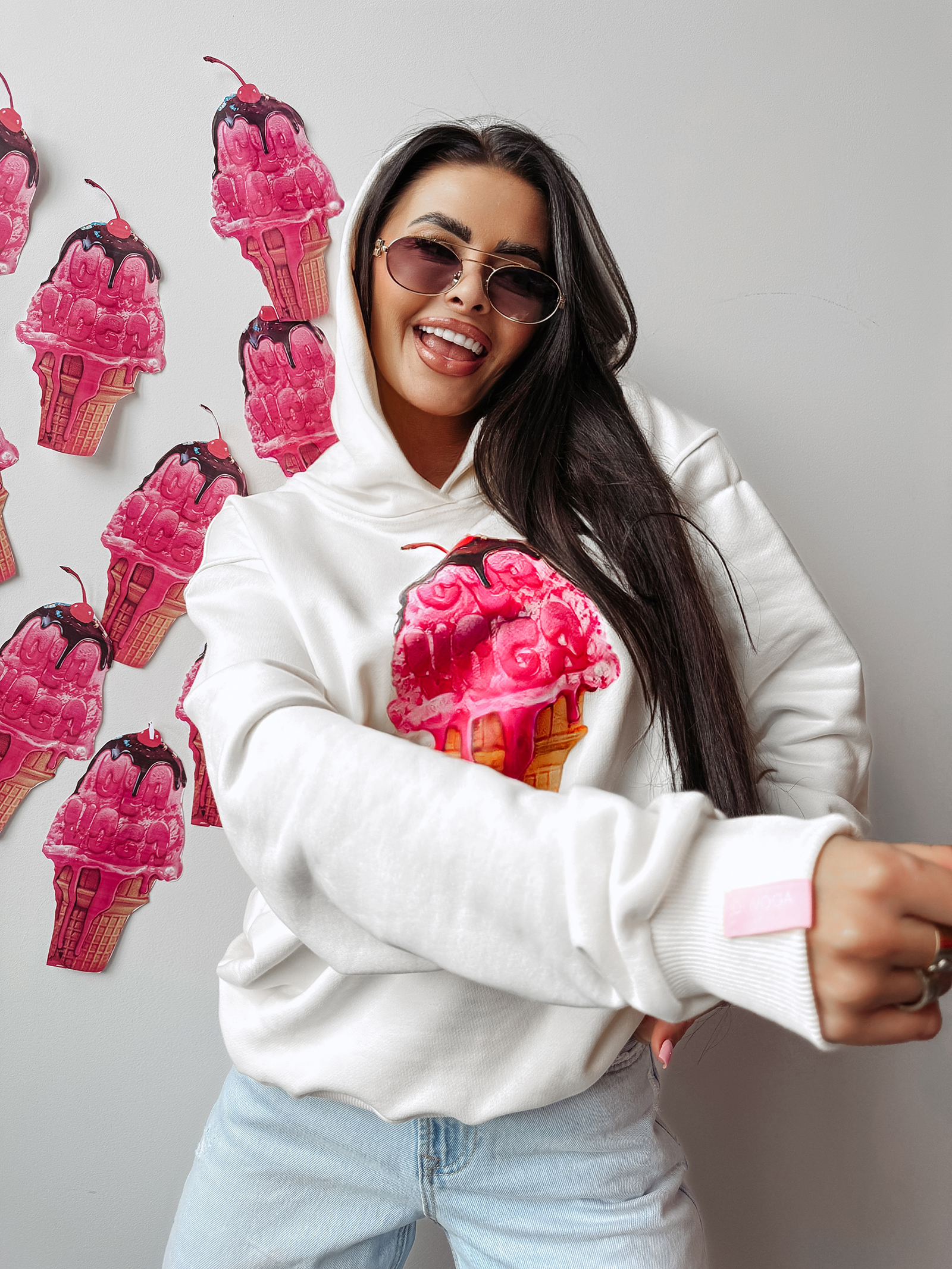 Bluza damska KIRAZ OLAVOGA – komfort i styl w jednym. Wykonana z wysokiej jakości materiału bawełnianego, gwarantuje wygodę i miękkość noszenia przez cały dzień. Delikatnie oversiz’owy krój z kapturem oraz prążkowane ściągacze na brzegach dodają jej modnego charakteru. Na jednym z rękawów znajduje się różowa naszywka z logiem marki, a na przodzie ciekawy print – lód z polewą – oraz minimalistyczne logo OLAVOGA, które dopełniają jej wyjątkowy design. Idealna do casualowych stylizacji, które łączą wygodę z odrobiną szaleństwa.