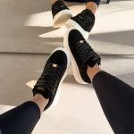 Buty typu sneakers – wykonane z tkaniny z monogramem – zaokrąglony nosek – wiązanie na sznurówki – kontrastowe wstawki – lekko podwyższona podeszwa