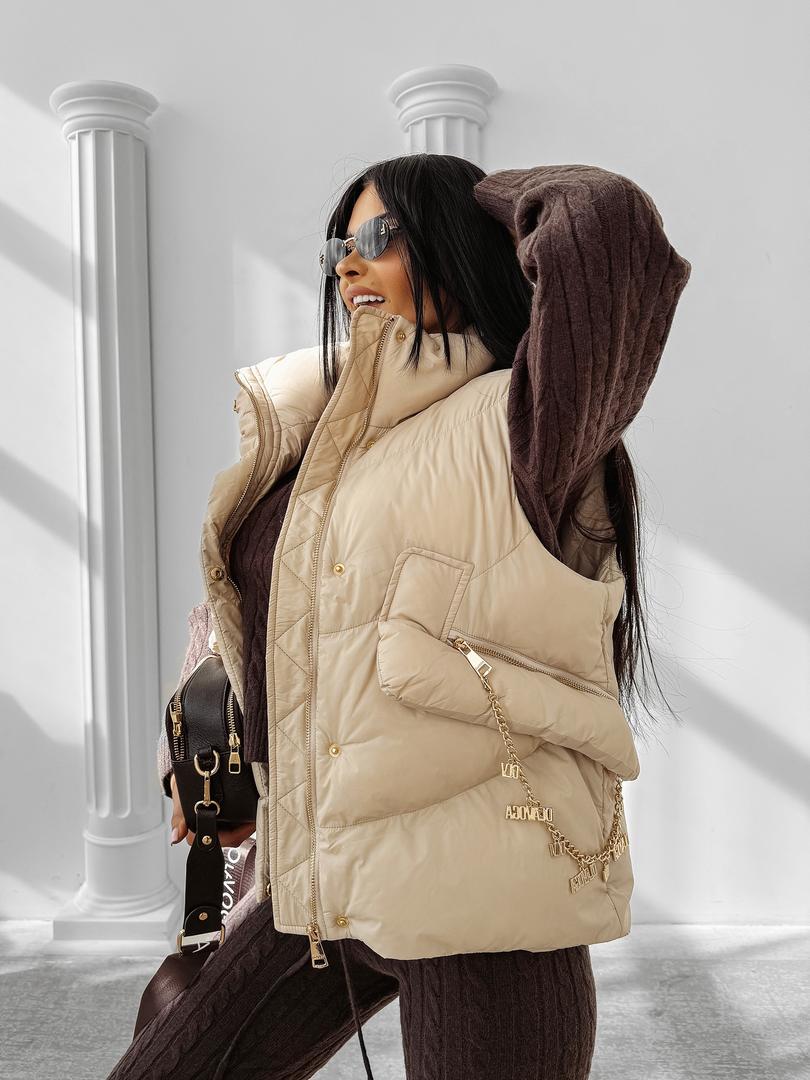Kamizelka damska OLAVOGA Rain to ponadczasowy produkt, który świetnie łączy w sobie modę i praktyczność. Oversize’owy krój sprawia, że doskonale pasuje do różnych stylizacji, a pikowana faktura dodaje lekkości i sportowego charakteru. Wysokiej jakości materiał gwarantuje trwałość i komfort, dzięki czemu możesz nosić ją przez wiele sezonów. Złote suwaki oraz łańcuszki z logowanymi zawieszkami podkreślają luksusowy charakter, który wyróżnia tę kamizelkę na tle innych produktów.