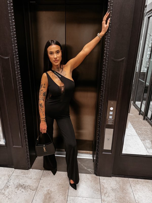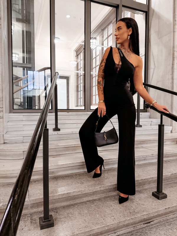 Kombinezon o dopasowanym kroju – rozszerzająca się nogawka – asymetryczny dekolt – wydłużająca elegancka linia – kontrastowy panel przy dekoldzie z siateczki – logowanie na ramiączku – elastyczna tkanina