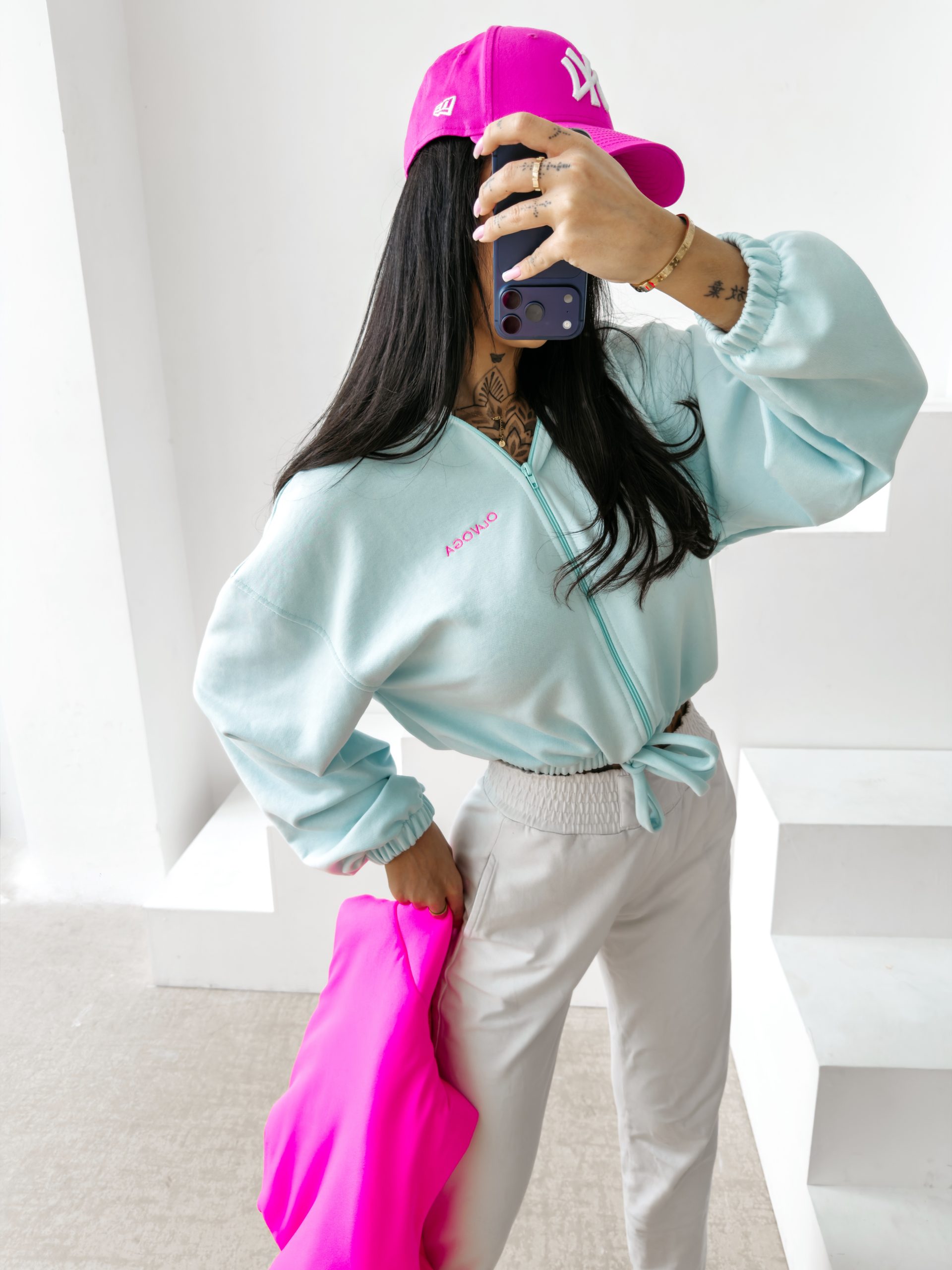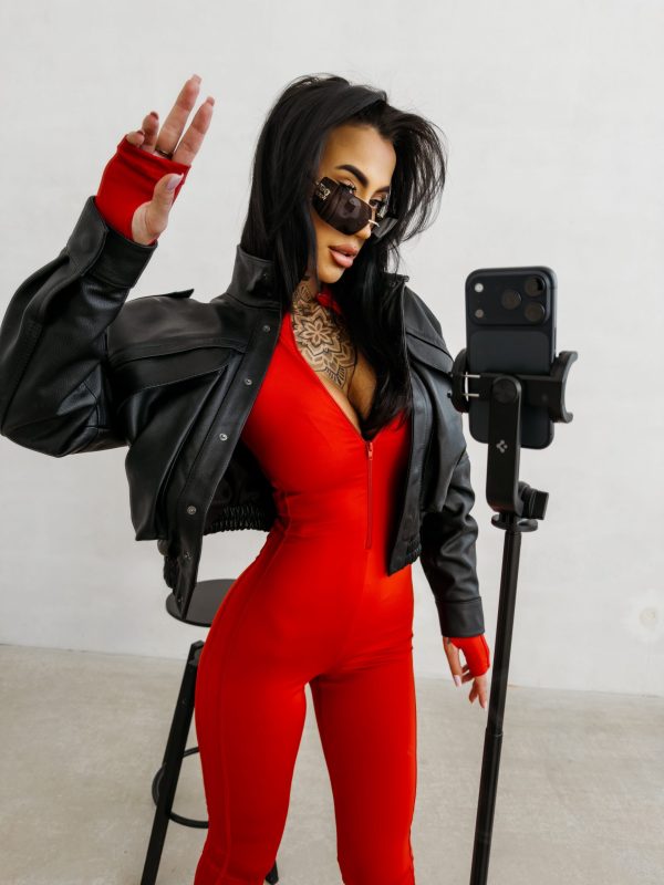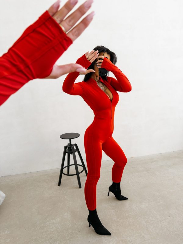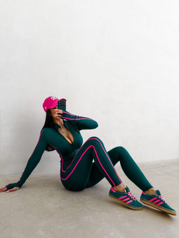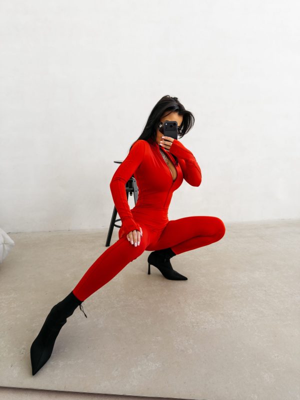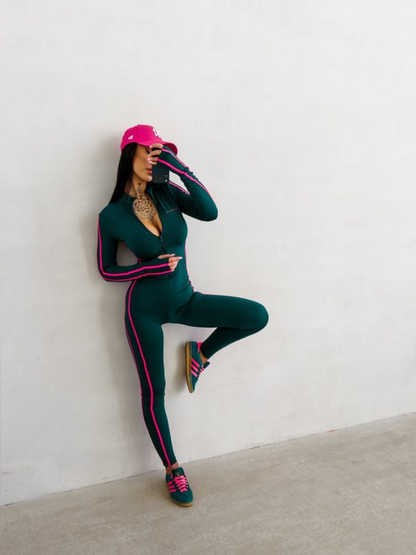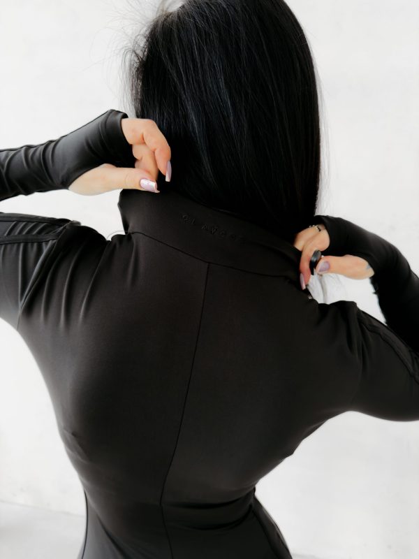 Kombinezon o dopasowanym, modelującym kroju wykonany z wysokiej jakości elastycznego. Model z długim rękawem i wysokim kołnierzem zapinanym na suwak. Kontrastowe lampasy wzdłuż rękawów i nogawek. Subtelne logo marki OLAVOGA z przodu.