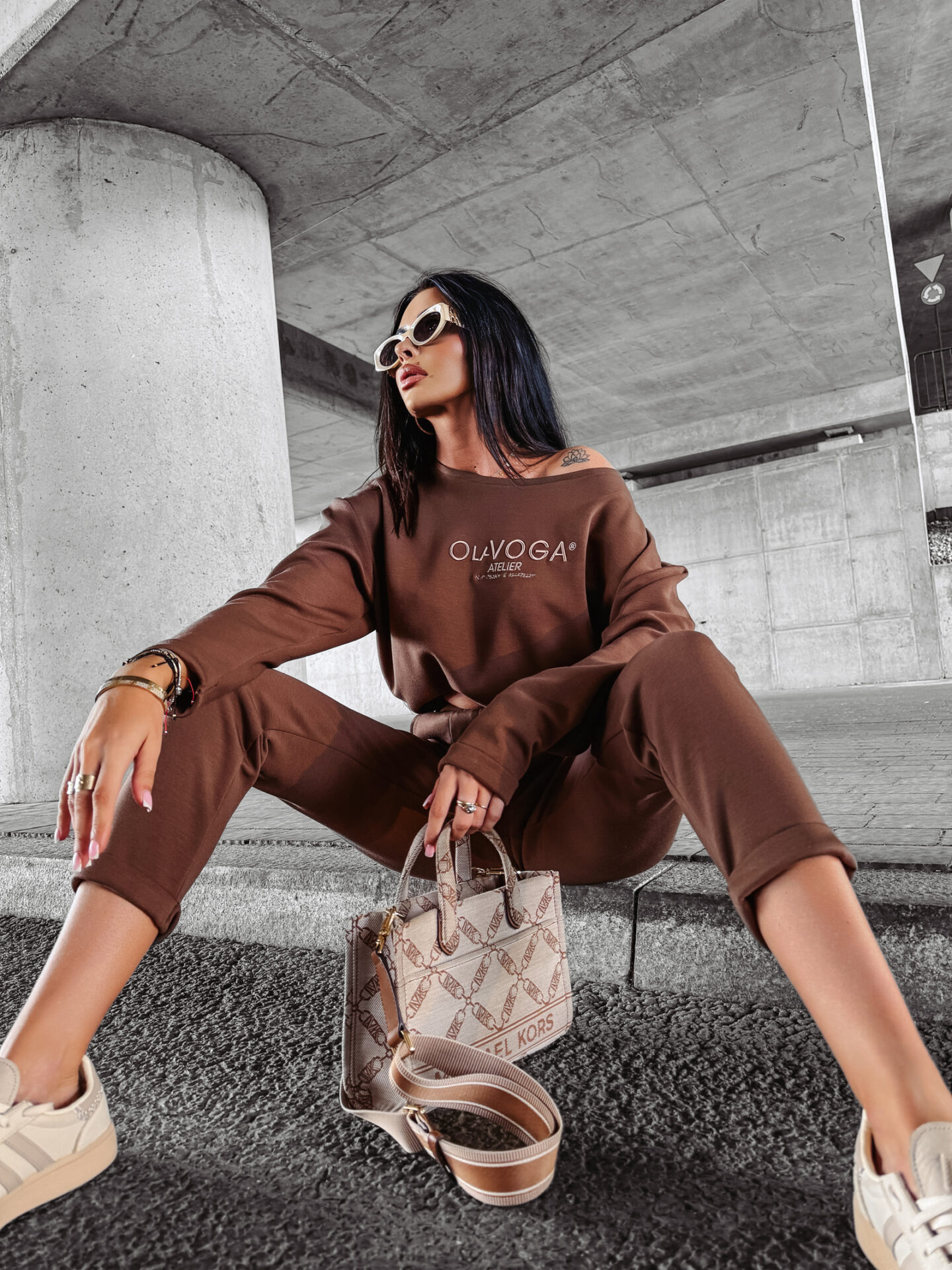 To gotowa stylizacja, która nie wymaga wysiłku – wystarczy dodać ulubione buty i dodatki, by stworzyć kompletny look na każdą okazję. Brązowy odcień dodaje całości elegancji i naturalnego ciepła, a subtelne haftowane logo OLAVOGApodkreśla luksusowy charakter zestawu.