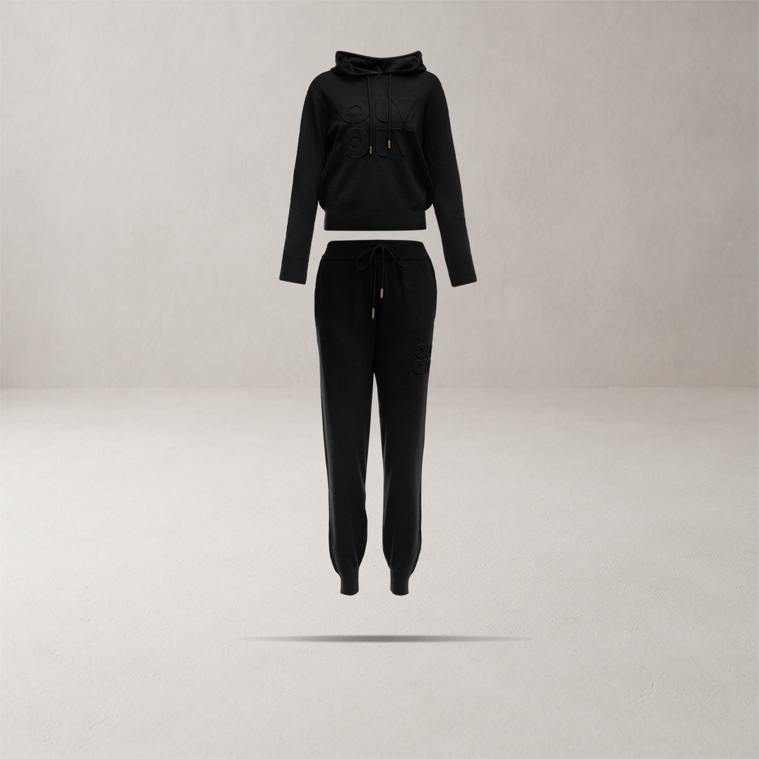 Tłoczone logo OLAVOGA na bluzie i spodniach podkreślające markę i jakość