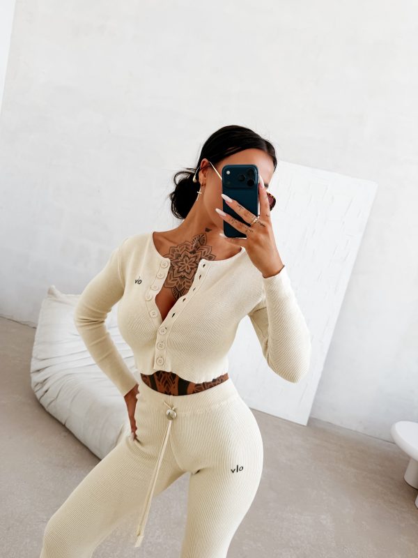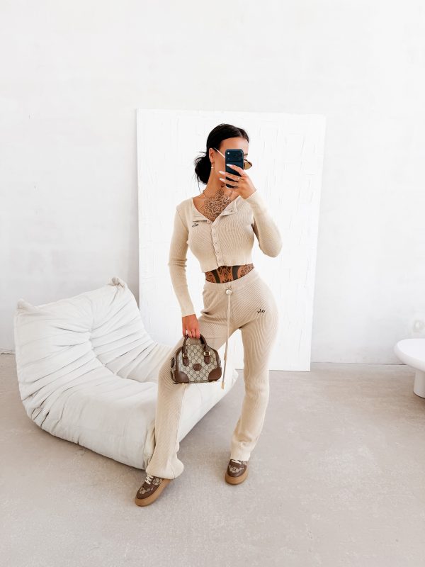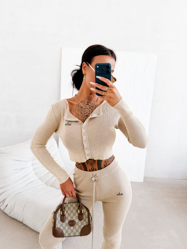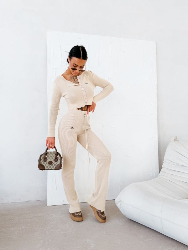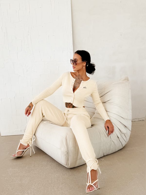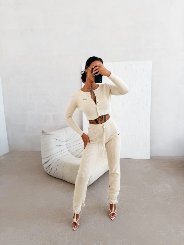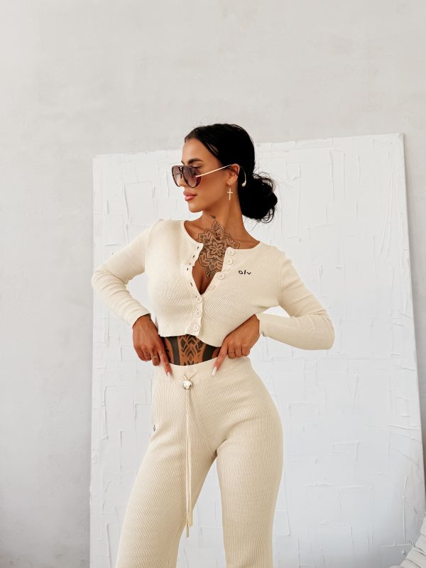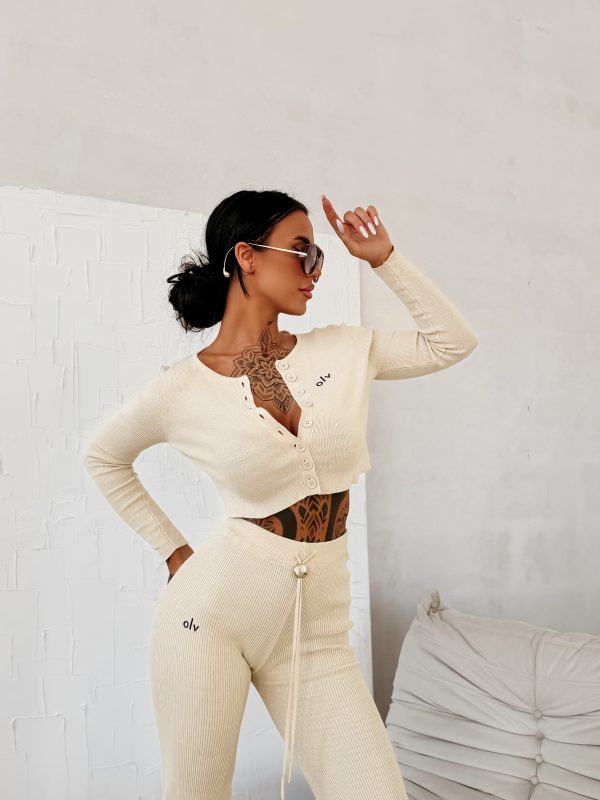 Top o skróconym kroju – zapinany na guziki – prążkowana sweterkowa dzianina – długi rękaw – zaokrąglony dekolt – subtelne logo OLV na przodzie. Spodnie o dopasowanym kroju – wyższy stan – regulacja w pasie – ozdobny metalowy stoper z logo OLV – sznureczki zakończone skórzanymi logowanymi agletami