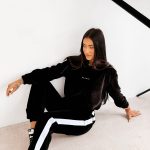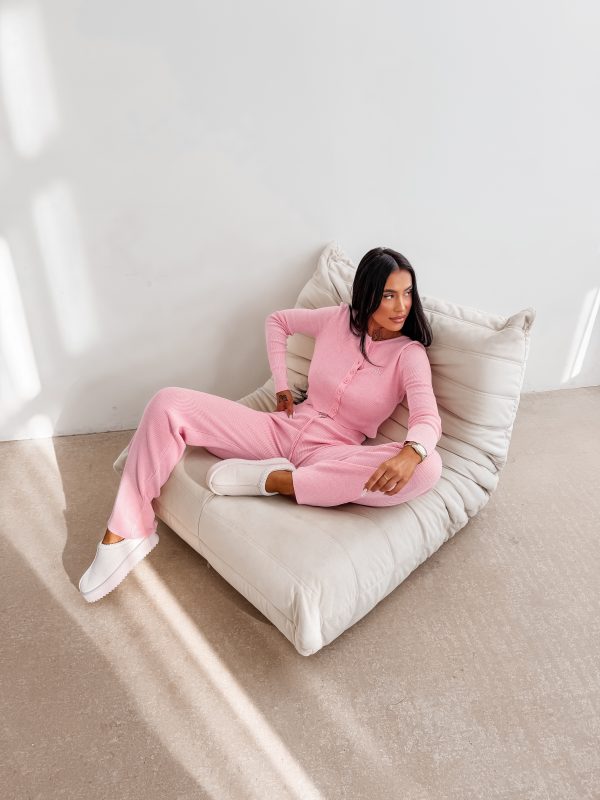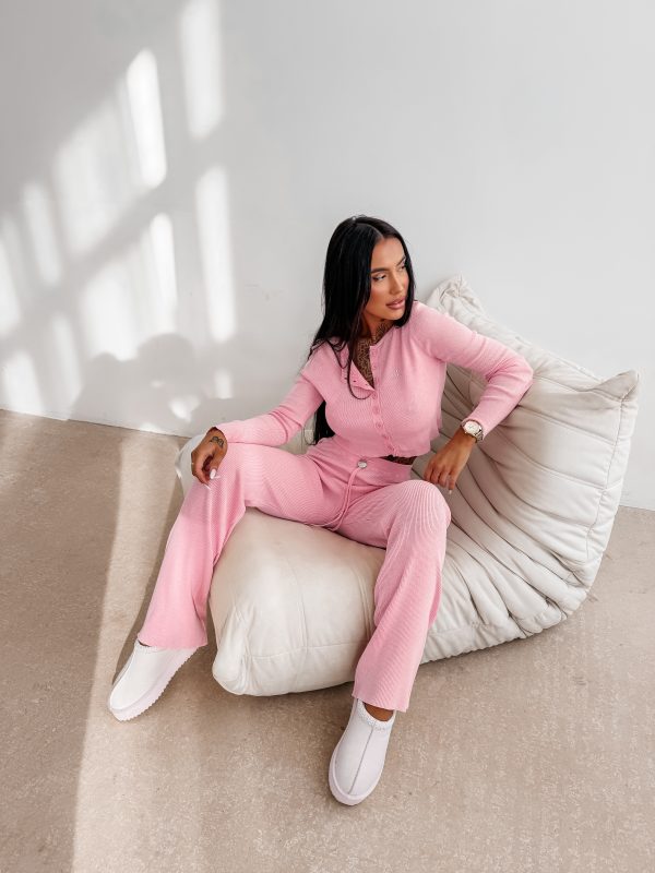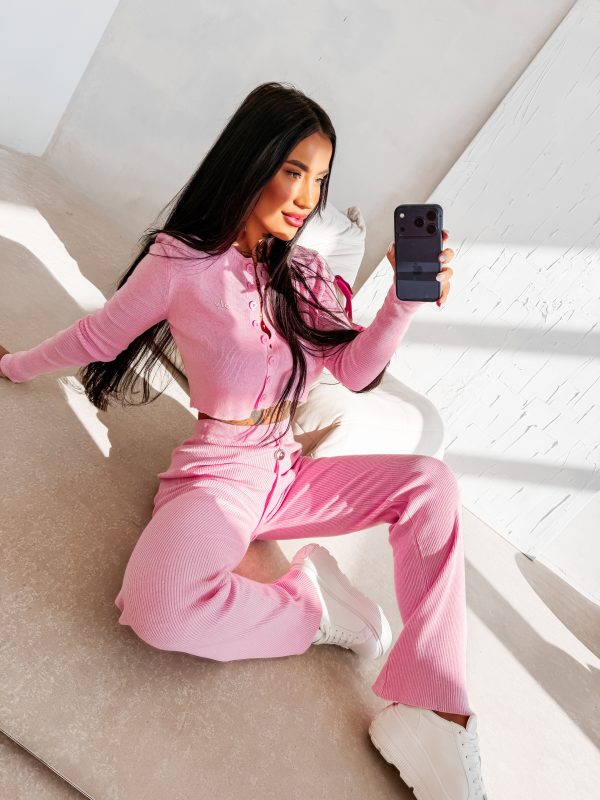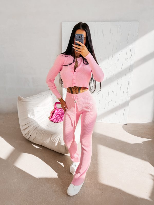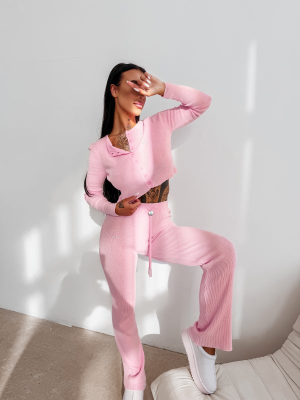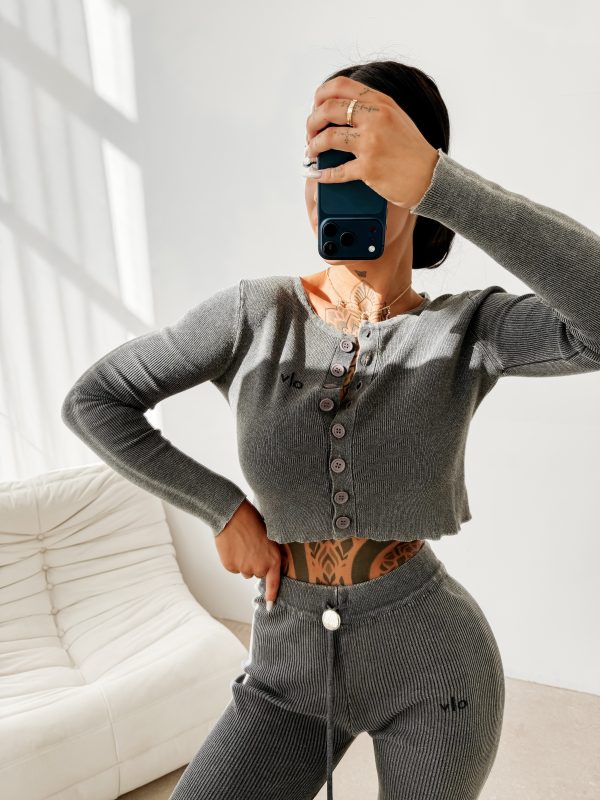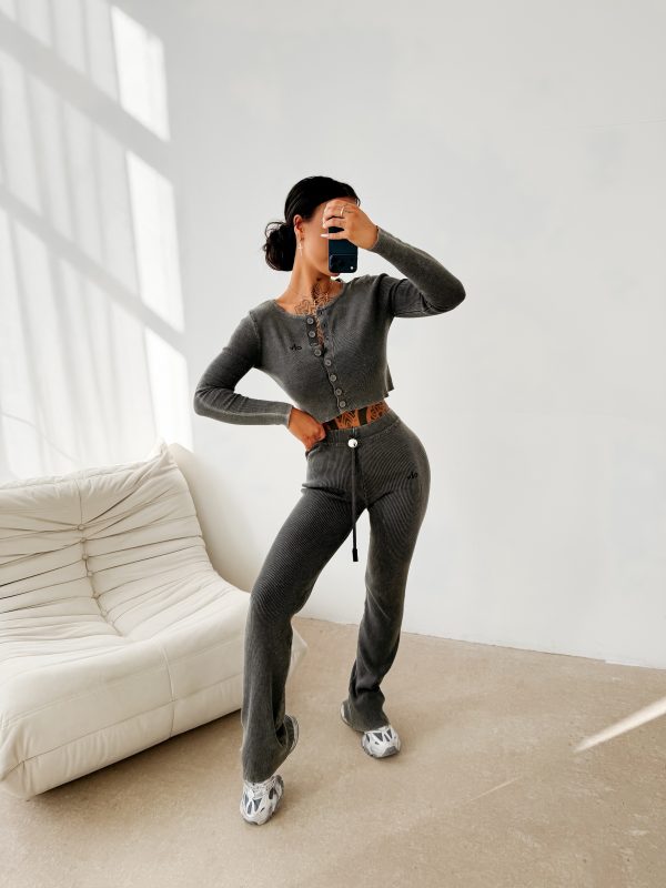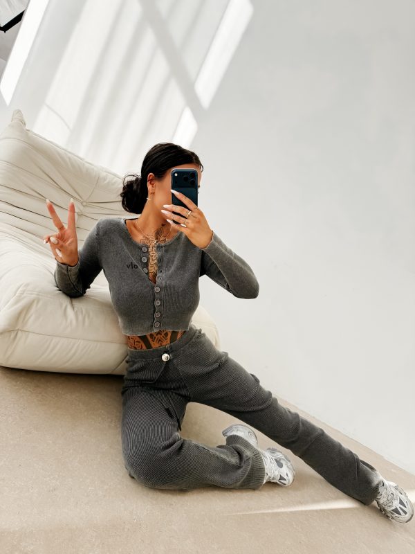 Top o skróconym kroju – zapinany na guziki – prążkowana sweterkowa dzianina – długi rękaw – zaokrąglony dekolt – subtelne logo OLV na przodzie. Spodnie o dopasowanym kroju – wyższy stan – regulacja w pasie – ozdobny metalowy stoper z logo OLV – sznureczki zakończone skórzanymi logowanymi agletami