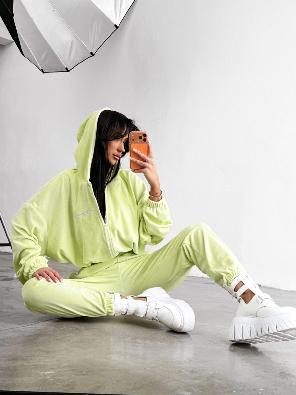 Bluza wchodząca w skład kompletu ma luźny, lekko skrócony krój, który dodaje jej nowoczesnej lekkości. Miękki materiał welurowy zapewnia przyjemne uczucie ciepła i delikatności podczas noszenia. Obszerny kaptur podkreśla casualowy charakter modelu, a suwak pozwala regulować sposób noszenia bluzy w zależności od potrzeb. Elastyczne ściągacze na rękawach i dole stabilizują krój, co sprawia, że model doskonale dostosowuje się do sylwetki i nie traci formy.
