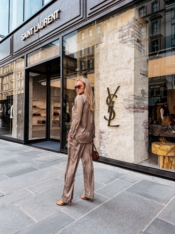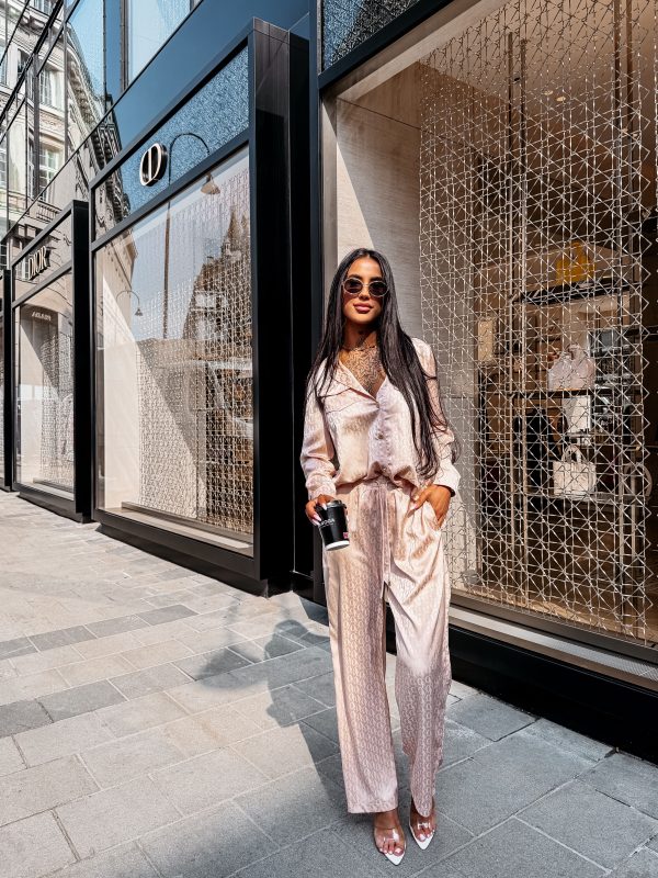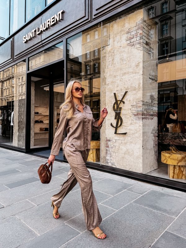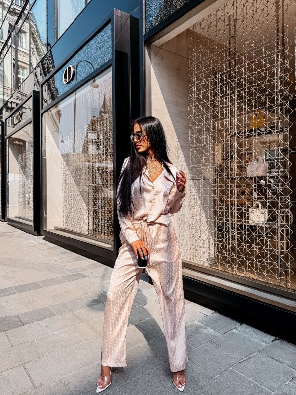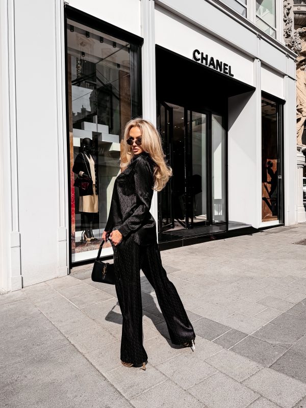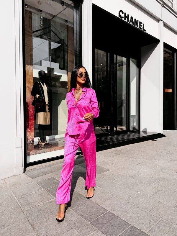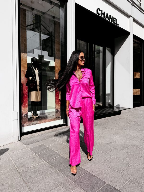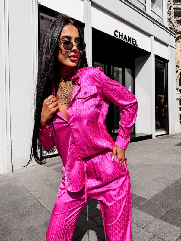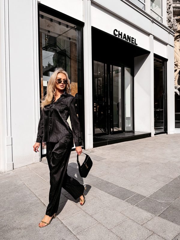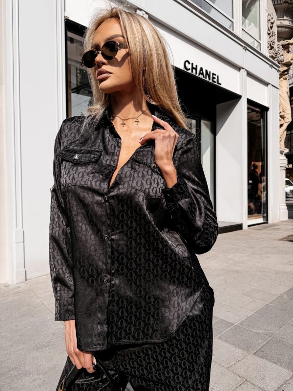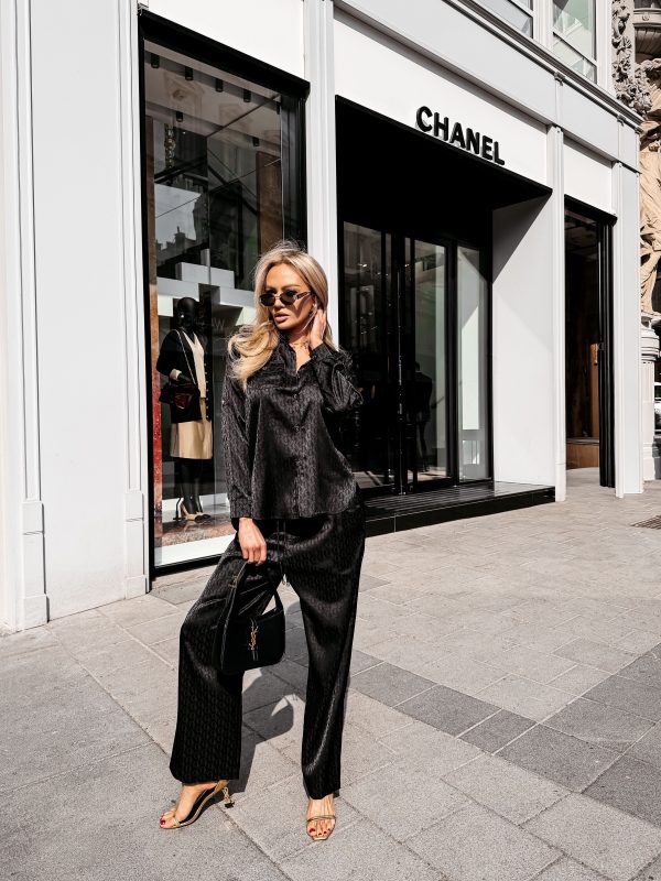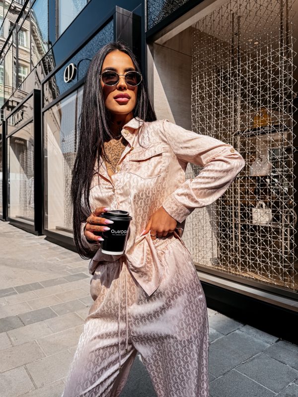 Swobodny krój – satynowe wykończenie – monogram na całości tkaniny – model zapinany na logowane guziki – klasyczny kołnierz – dwie naszywane kieszenie na koszuli – zakładka na plecach – rękawy zakończone mankietami zapinanymi na guzik Spodnie o luźnym kroju – szeroka prosta nogawka – elastyczny pas – wiązanie w pasie zakończone złotymi agletami – lejąca tkanina o subtelnym połysku – monogram all over