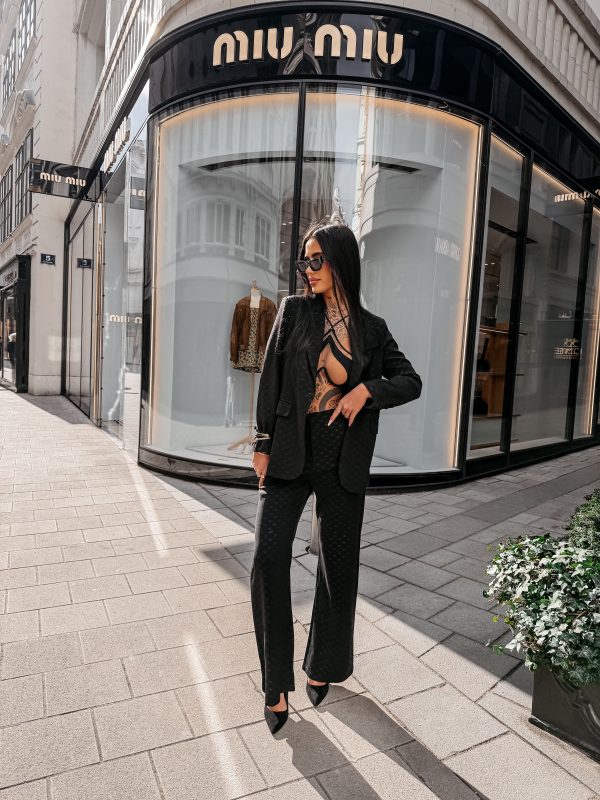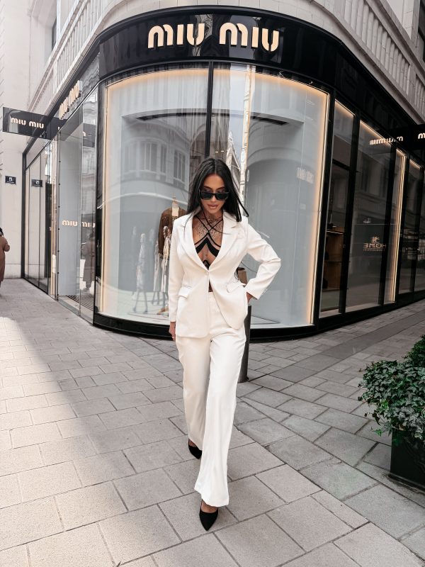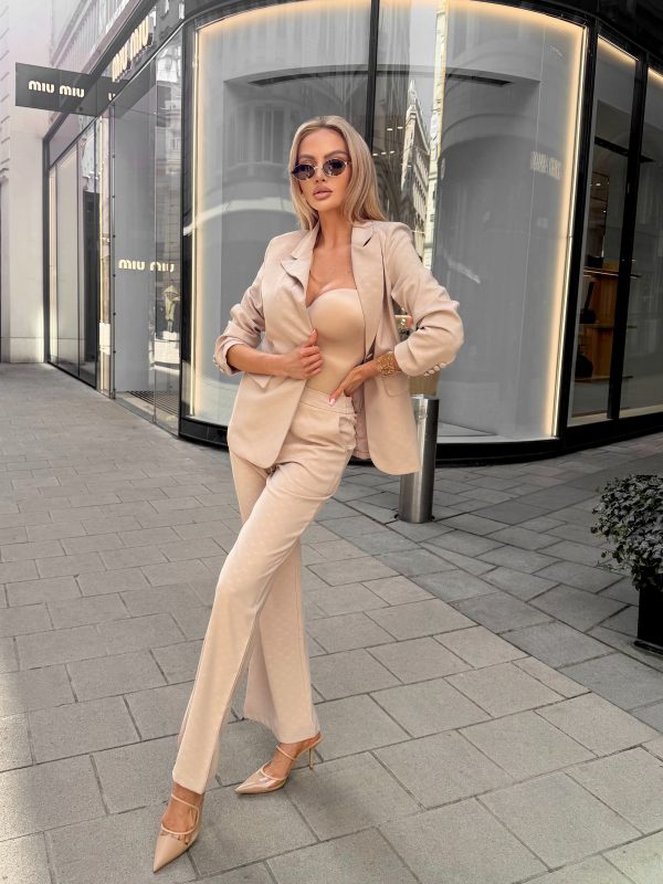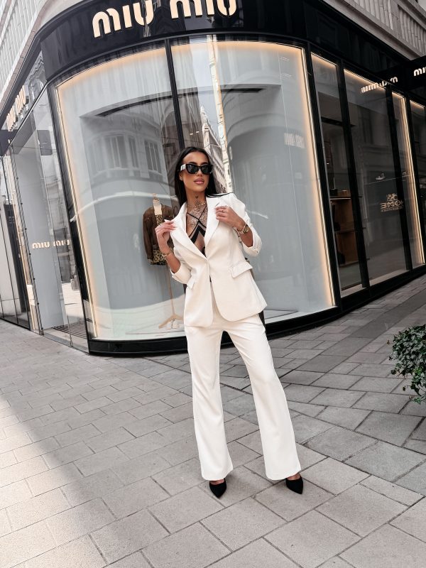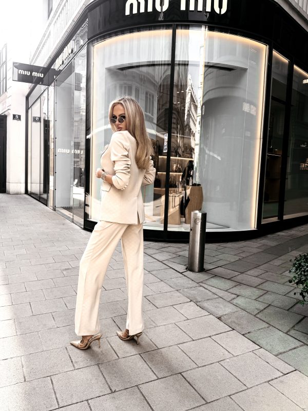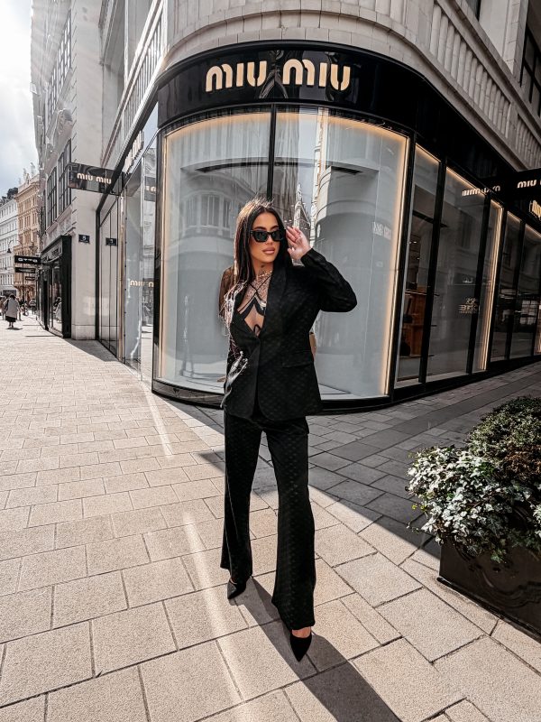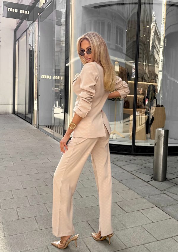 Marynarka z klasycznymi klapami – długi rękaw – pęknięcie na mankiecie z obciąganymi guzikami z tej samej tkaniny – kieszenie z patkami – zaszewki modelujące sylwetkę – tkanina z minimalistycznym monogramem Spodnie z wyższym stanem – prosta szeroka nogawka – zapięcie na suwak i guzik – tkanina z minimalistycznym monogramem