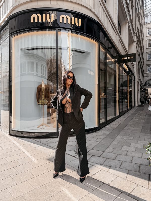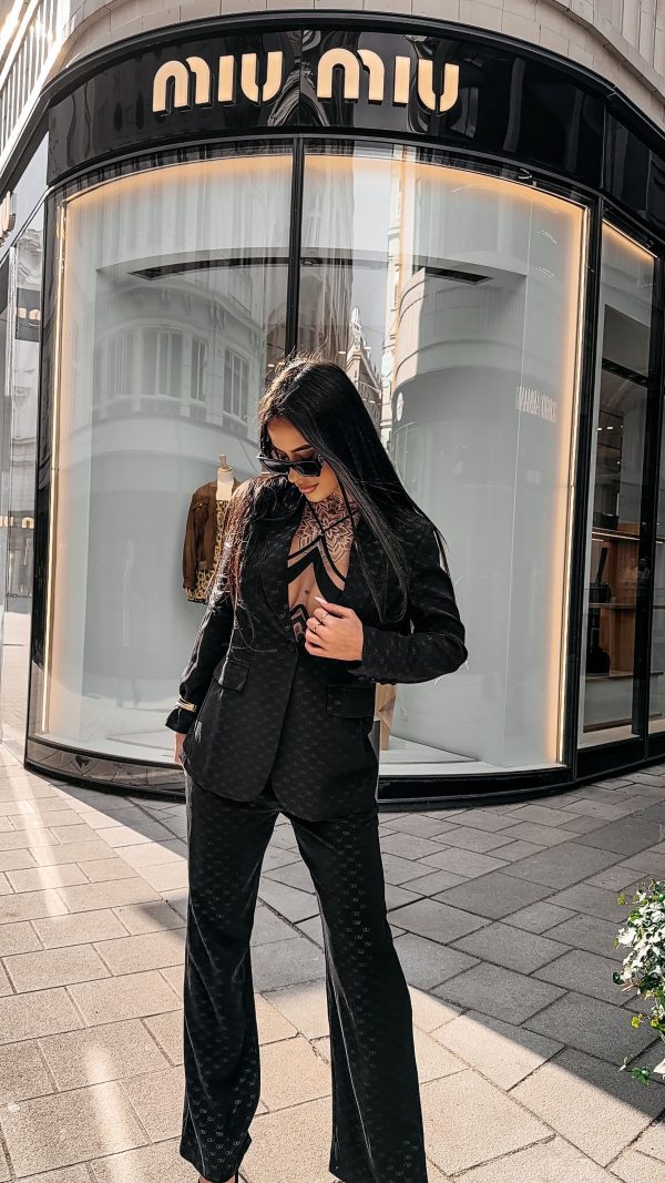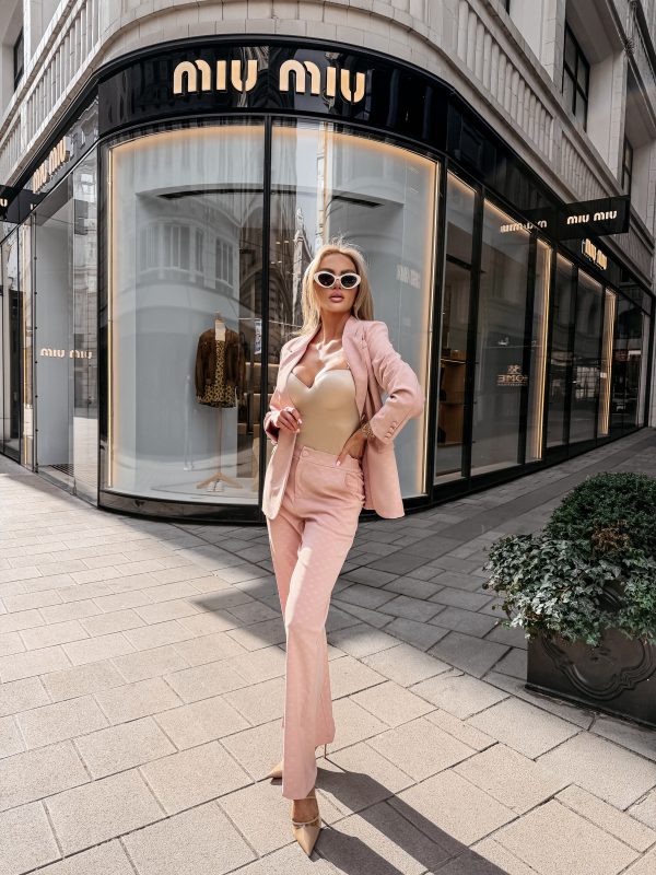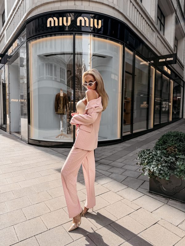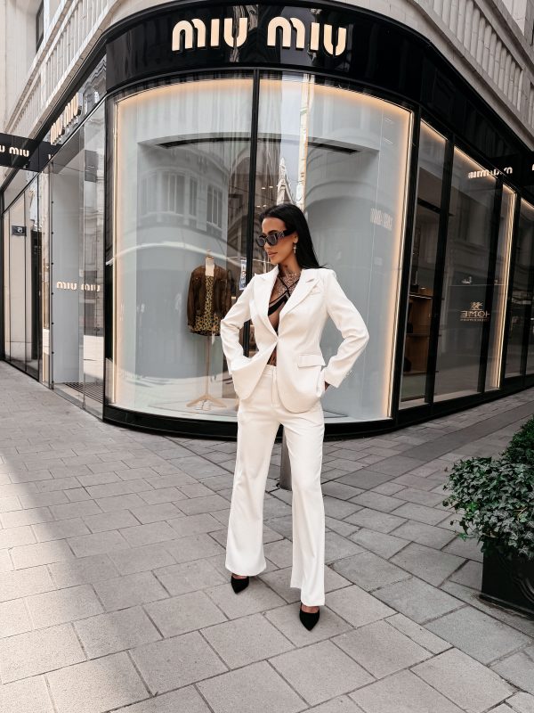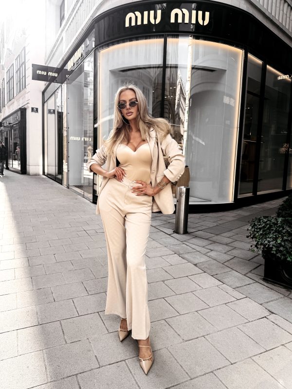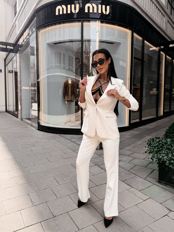 Marynarka z klasycznymi klapami – długi rękaw – pęknięcie na mankiecie z obciąganymi guzikami z tej samej tkaniny – kieszenie z patkami – zaszewki modelujące sylwetkę – tkanina z minimalistycznym monogramem Spodnie z wyższym stanem – prosta szeroka nogawka – zapięcie na suwak i guzik – tkanina z minimalistycznym monogramem