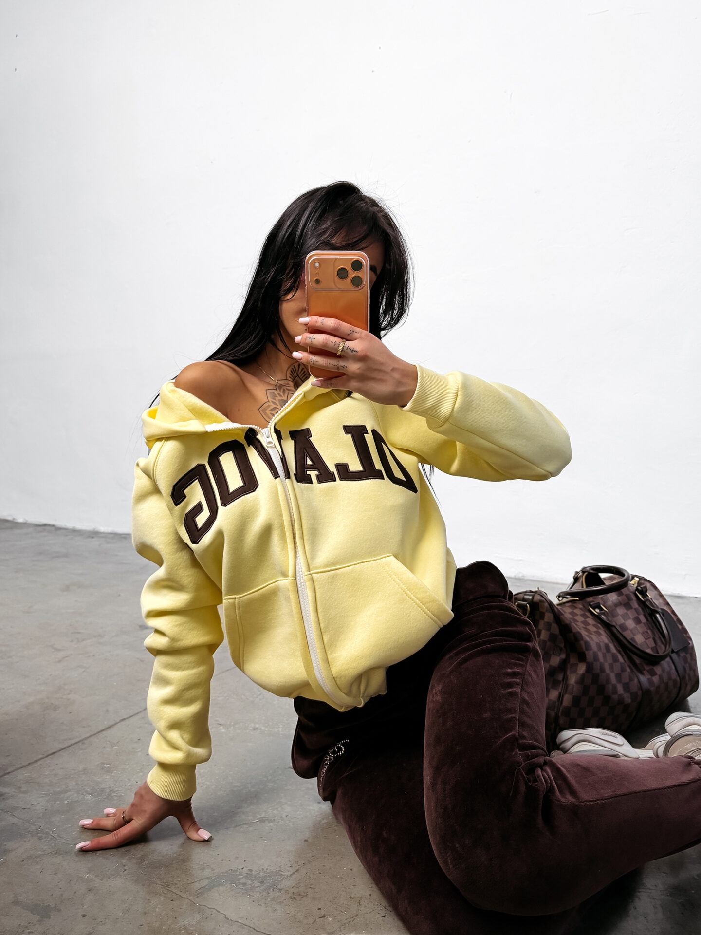 Komplet sportowy, wykonany z wysokiej jakości materiału z domieszką wiskozy. Góra – rozpinana bluza z kapturem oraz z rozpinanymi kieszeniami po bokach. Produkt posiada ciekawe zdobienie – dodatkowy logowany materiał u góry. Na proszę logo marki OLAVOGA. Dół – sportowe spodnie z rozpinanymi kieszeniami po bokach. Talia regulowana poprzez sznurek z logowanym agletem. Prążkowane ściągacze na brzegach. Na przodzie logo brandu w ciekawej grafice.