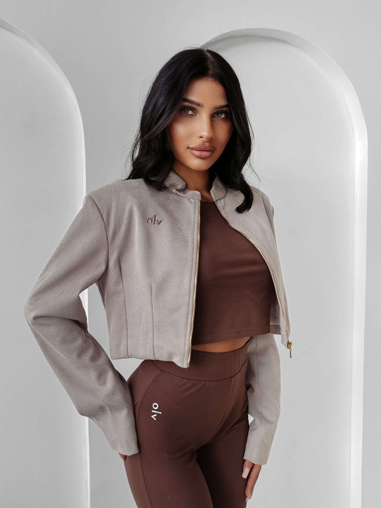 Na przedzie kurtki znajduje się subtelne logo OLV – znak rozpoznawczy marki OLAVOGA. Zostało umieszczone w taki sposób, aby nie dominować stylizacji, a jedynie podkreślać markowy charakter produktu. Kurtka zapinana jest na zamek błyskawiczny, co ułatwia zakładanie i zdejmowanie oraz pozwala na regulację stopnia okrycia w zależności od pogody.