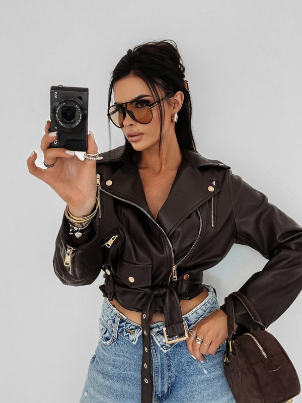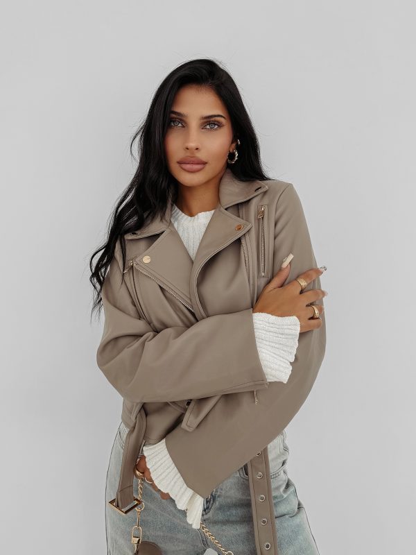 Ramoneska – ekoskóra – rockowy charakter – ozdobne złote suwaki z logowanymi pullerami – wyposażony w pasek z klamrą – kieszenie zapinane na suwak – złote logo OLAVOGA na plecach – logowana podszewka