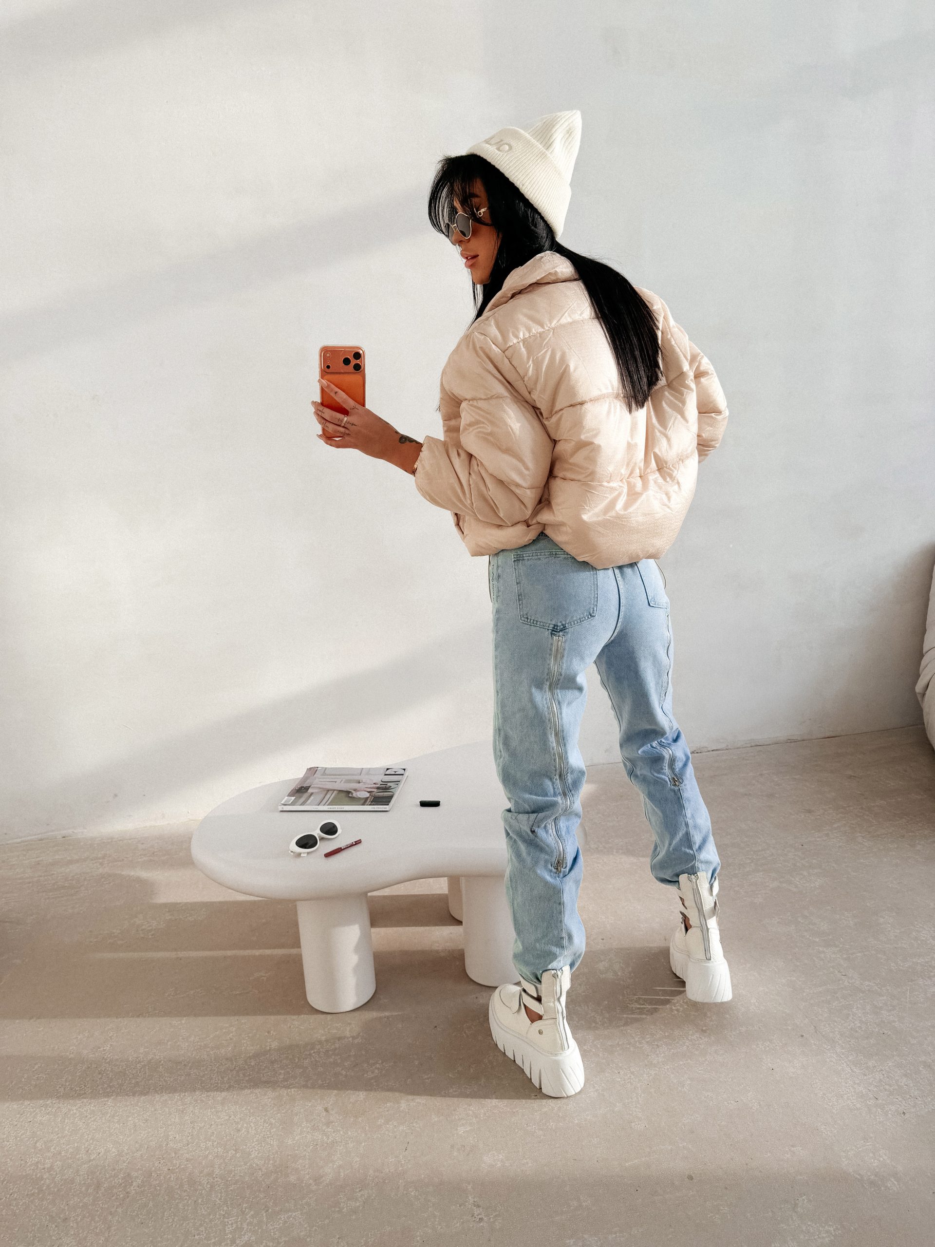 Bomberkowy krój – na podszewce – gładki lekko połyskujący materiał – zapinana na metalowy złoty suwak z logowanym pullerem – ściągacze przy rękawach, dole i przy stójce – subtelne haftowane logo na przodzie – cięte kieszenie z wypustkami na przodzie
