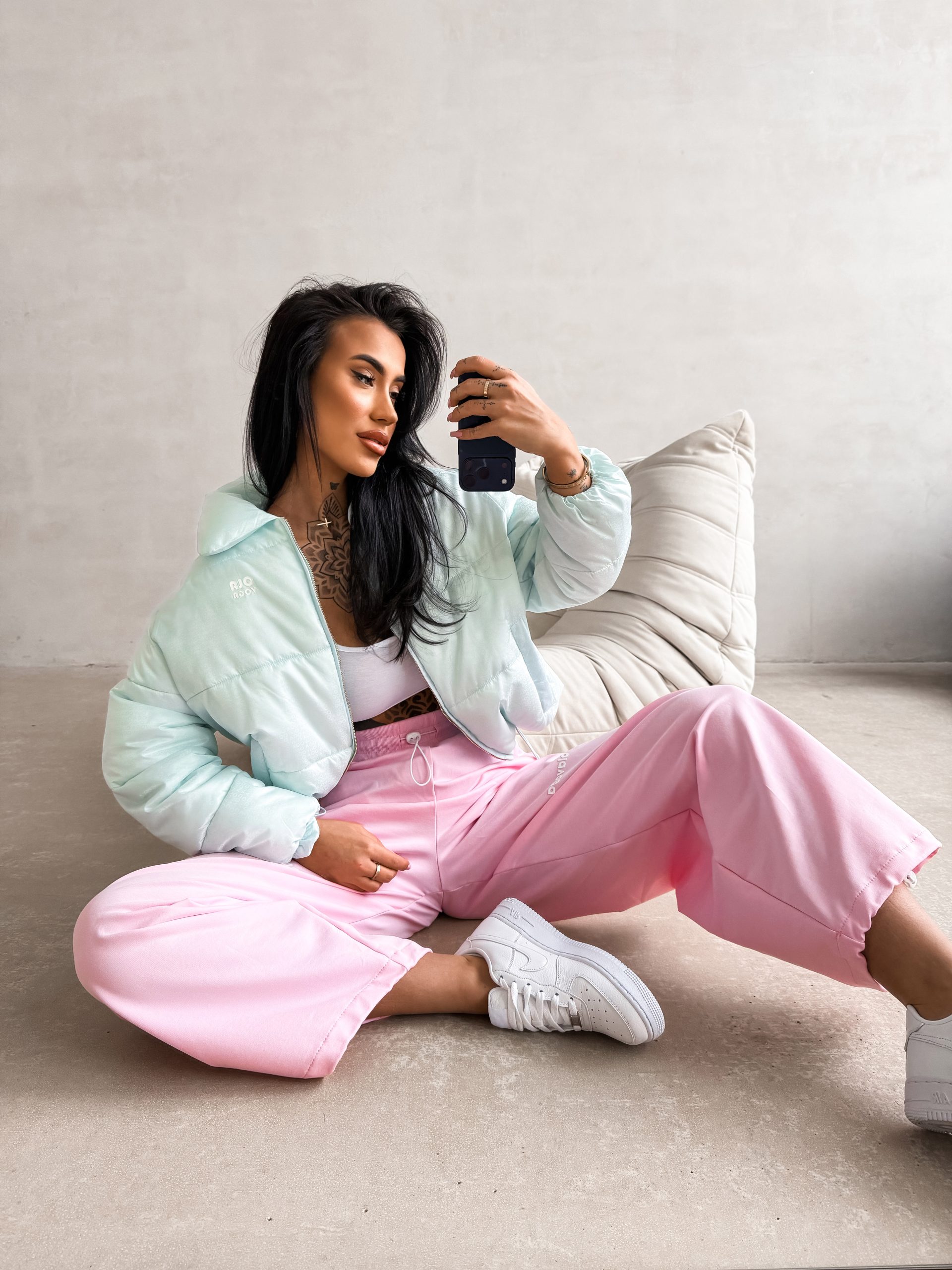 Bomberkowy krój – na podszewce – gładki lekko połyskujący materiał – zapinana na metalowy złoty suwak z logowanym pullerem – ściągacze przy rękawach, dole i przy stójce – subtelne haftowane logo na przodzie – cięte kieszenie z wypustkami na przodzie