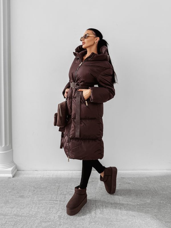 Każdy detal w kurtce został zaprojektowany celowo: długi fason chroni przed chłodem i wiatrem, pikowania dodają tekstury, a delikatny połysk materiału przyciąga subtelne światło. Kaptur z możliwością regulacji pozwala dopasować ochronę do aktualnej pogody. Wszyty suwak przy logo OLAVOGA daje pełną kontrolę nad jego widocznością, co pozwala dopasować styl do konkretnej stylizacji. Pasek z tłoczonym logo modeluje talię i dodaje wyrazistości, zaś złote elementy dopełniają luksusowego wyglądu bez przesady.