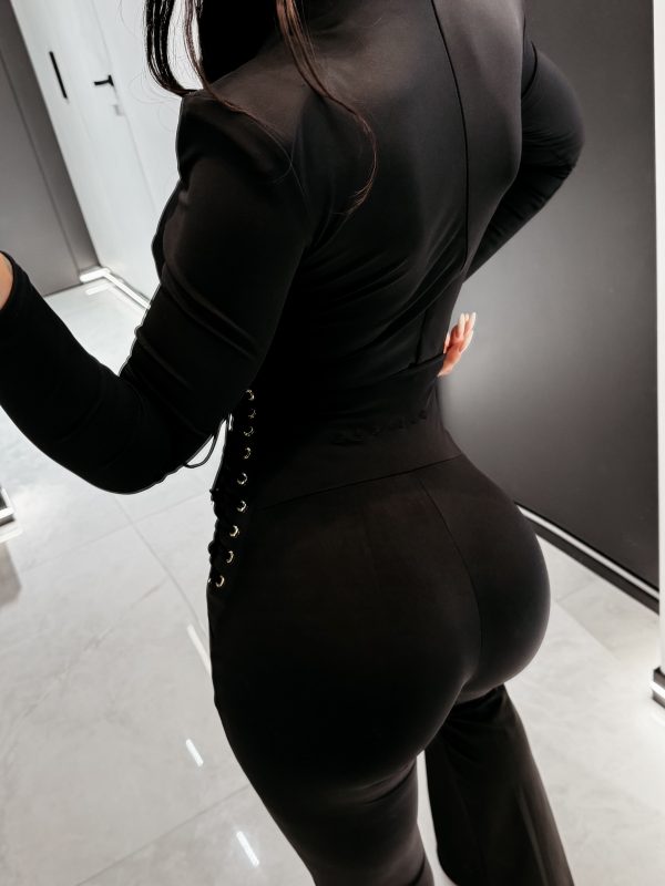 Przylegający krój – wysoki stan – nogawka typu flare – boczne wiązania ze złotymi oczkami – modelująca konstrukcja – na tyle subtelne logo w kolorze