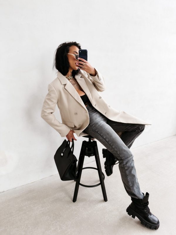 Płaszcz damski o klasycznym, prostym kroju. Wykonany z wysokiej jakości miękkiej tkaniny o gładkiej strukturze. Model zapinany na guziki, z eleganckim kołnierzem i długim rękawem. Na plecach subtelne, złote logo marki OLAVOGA. Po bokach kieszenie.