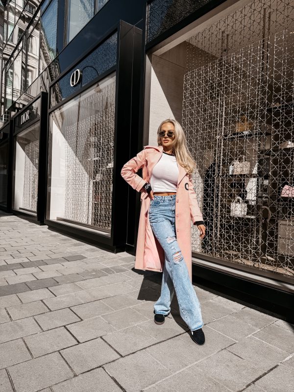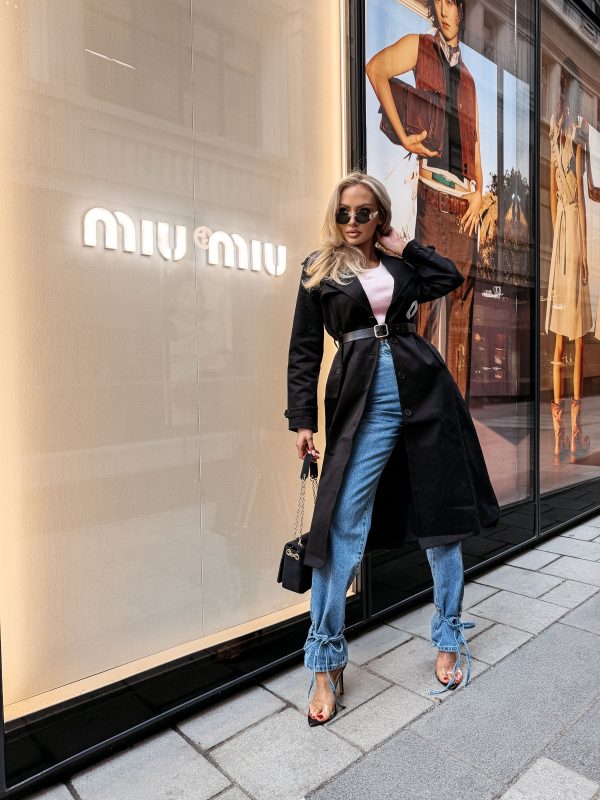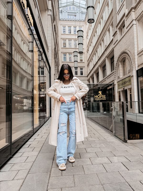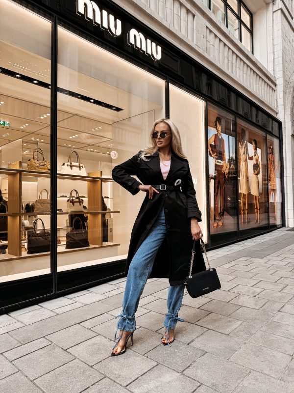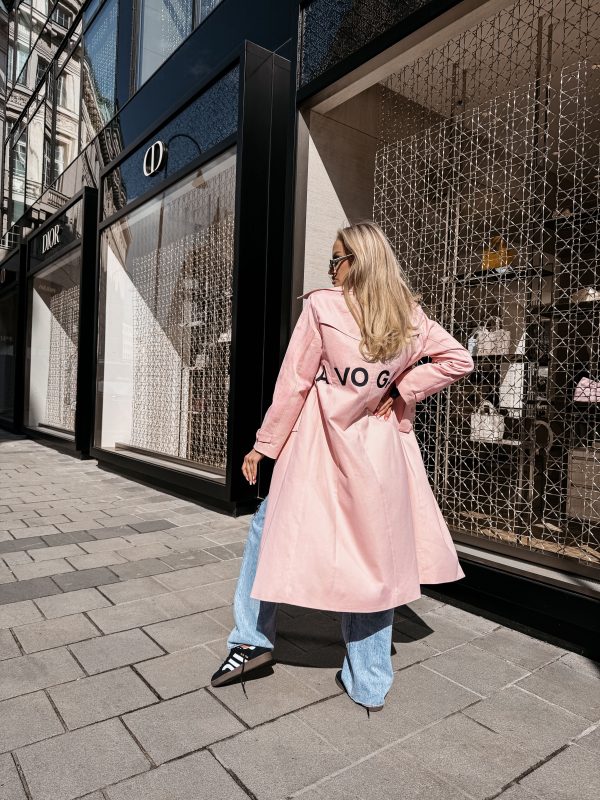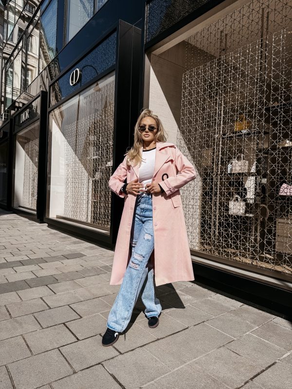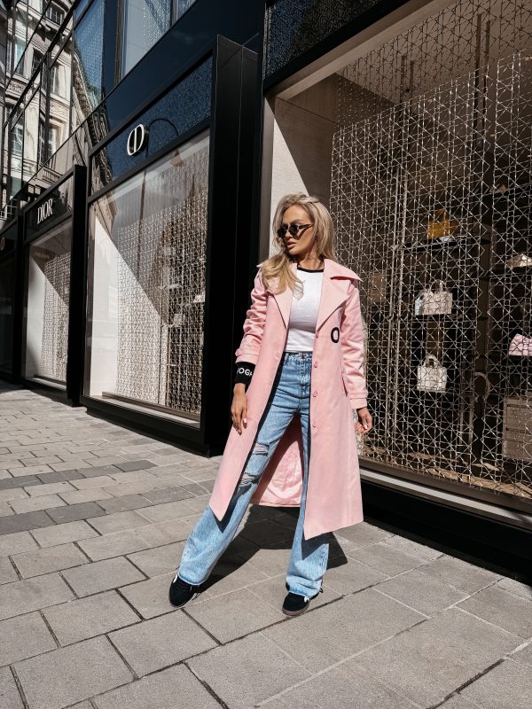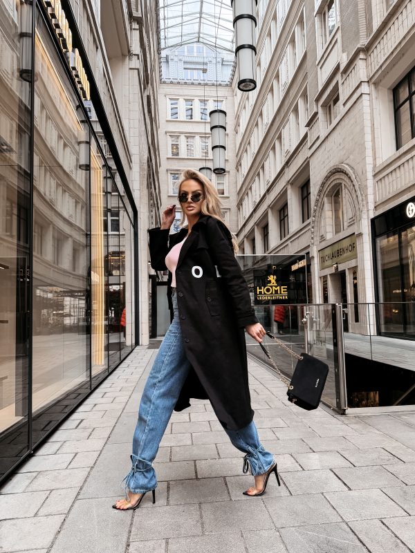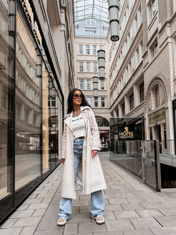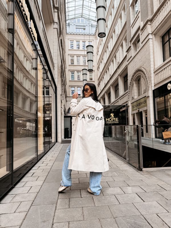 Płaszcz typu trencz – długość midi – wysokogatunkowa tkanina – klasyczny kołnierz – szerokie klapy – logowane guziki – pasek z klamrą w talii – długi rękaw z regulacją przy mankietach – duże nadrukowane logo OLAVOGA w kontrastującym kolorze