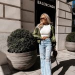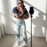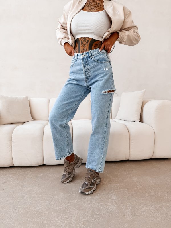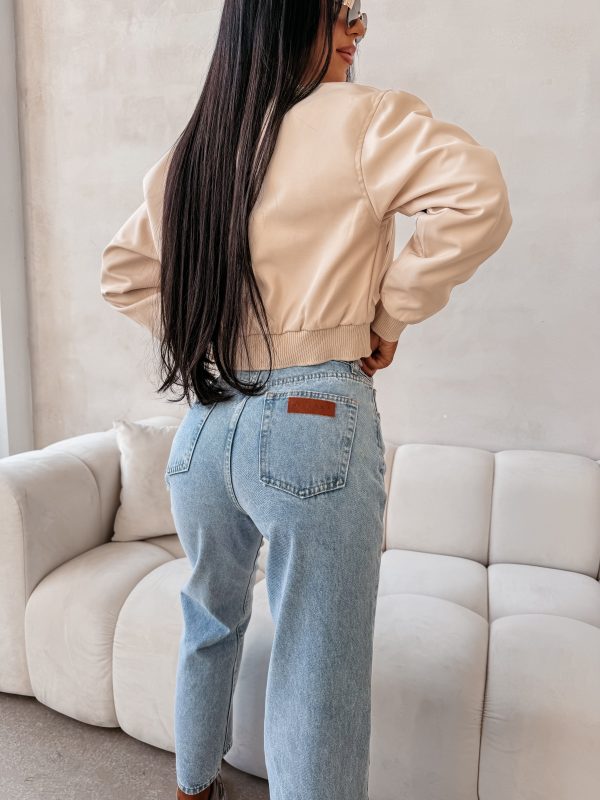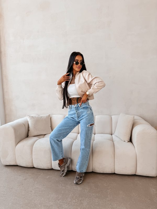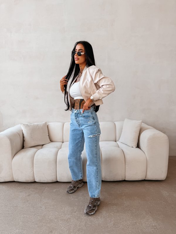 Spodnie jeansowe o klasycznym kroju – proste nogawki – model z wysokim stanem – na przodzie subtelne logo – na boku designerskie rozcięcie – skórzana naszywka na tyle z logo