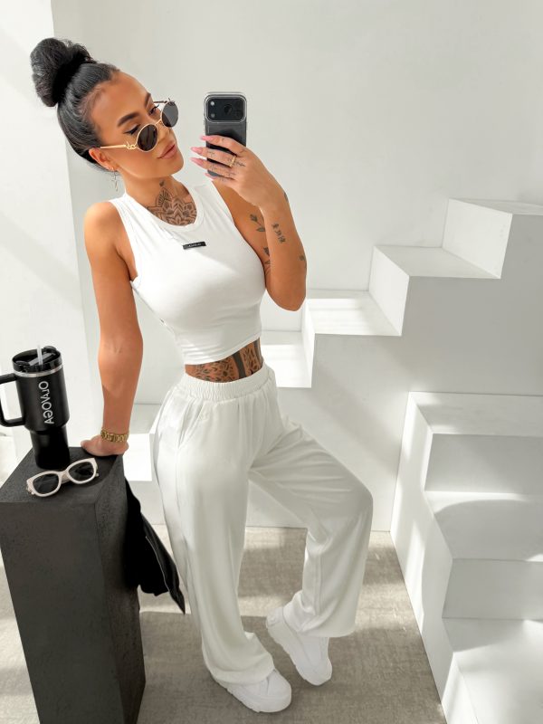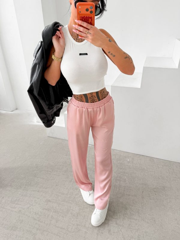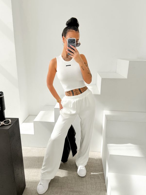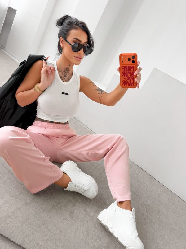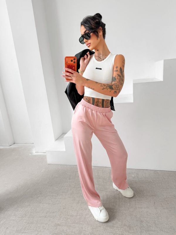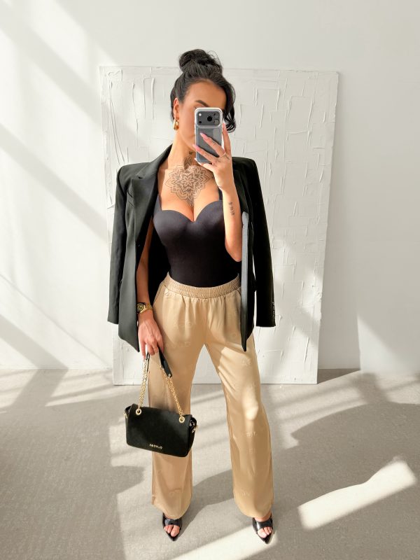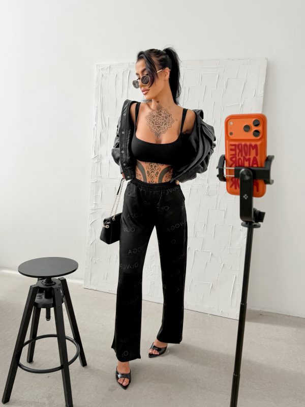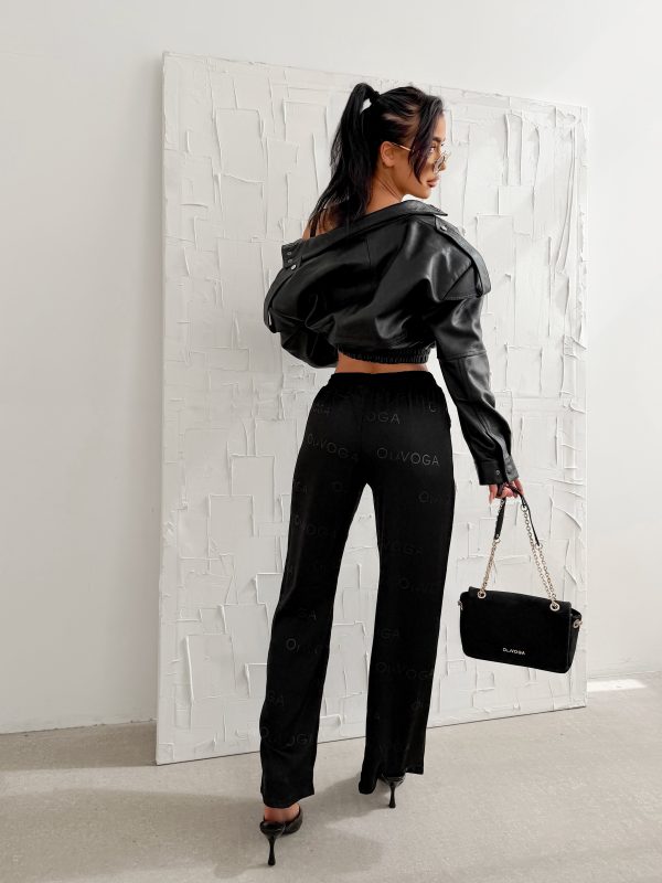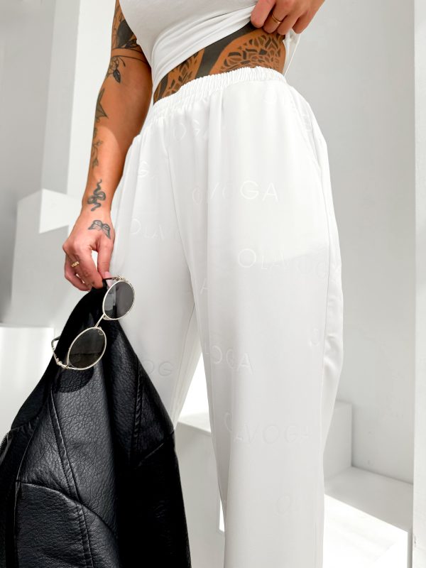 Luźniejszy krój – prosta lekko rozszerzana nogawka – miękko układająca się tkanina – elastyczna talia – na całych spodniach tonalne logowanie OLAVOGA.