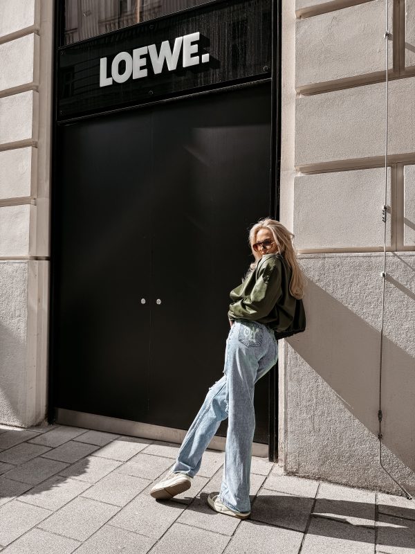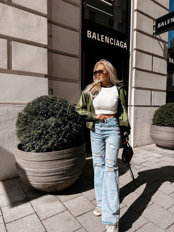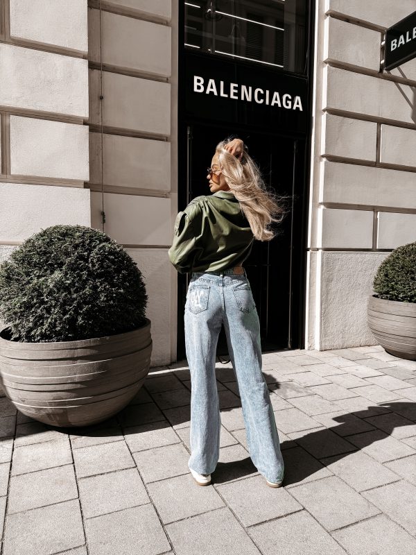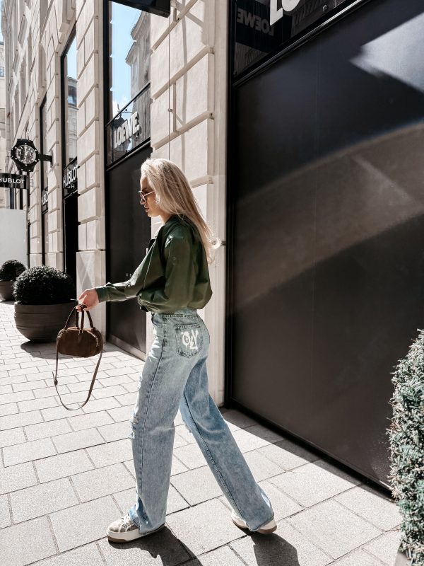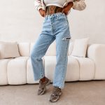 Denim bawełniany – nogawki proste z lekkim rozszerzeniem – wysoki stan – washed efekt – przetarcia i detale distressed – klasyczne kieszenie -szlufki na pasek – efektowny nadruk na kieszeni