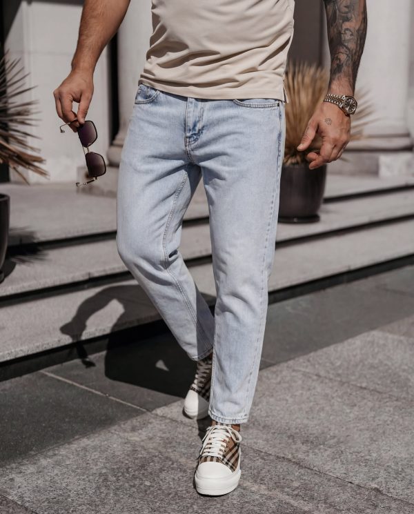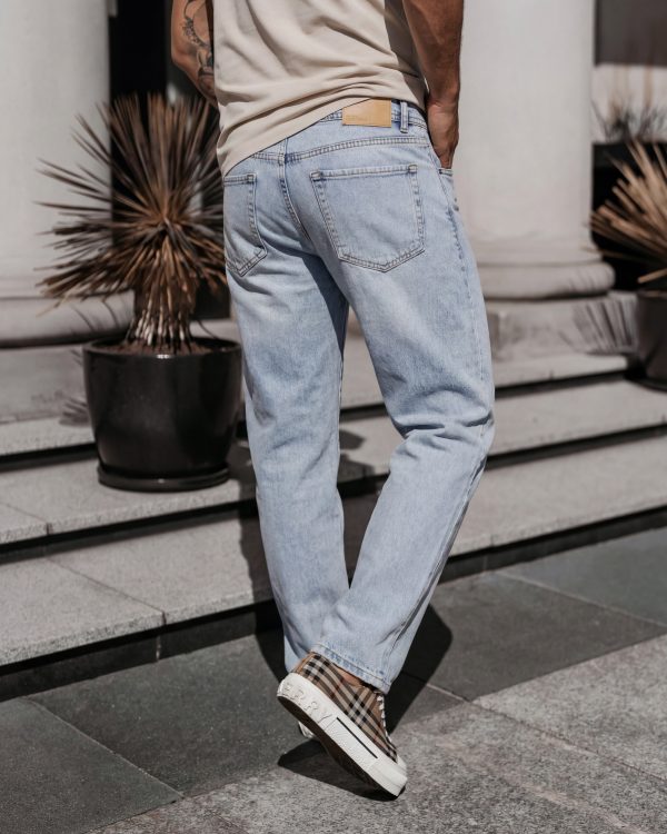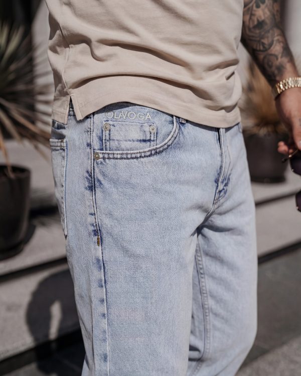 Denim o lekko zwężanym kroju – prosta linia nogawki – jasny denim o subtelnym efekcie distressed – klasyczny układ kieszeni – zapięcie na logowany guzik i zamek – subtelny haft z logo brandu