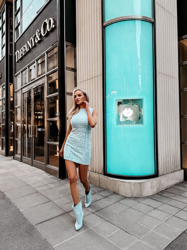 Dopasowany krój – elastyczna dzianina – zabudowany dekolt – krótki rękaw – długość mini – nadruk all over z logo OLAVOGA
