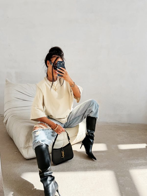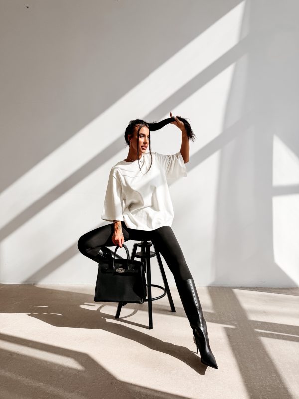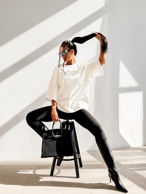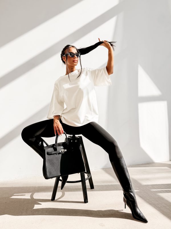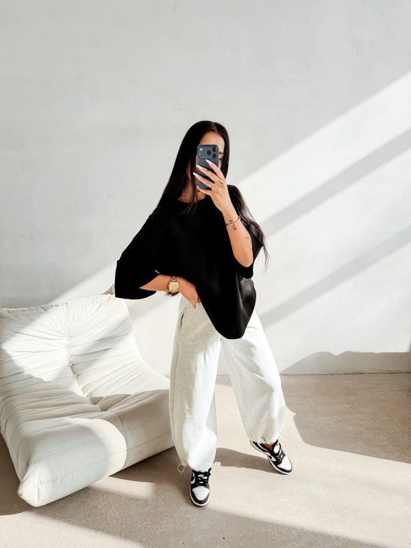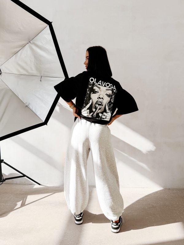 Oversize’owy fason – okrągły dekolt – szeroki, krótki rękaw – poduszki na ramionach – minimalistyczny przód – na tyle mocny akcent graficzny i logo OLAVOGA