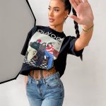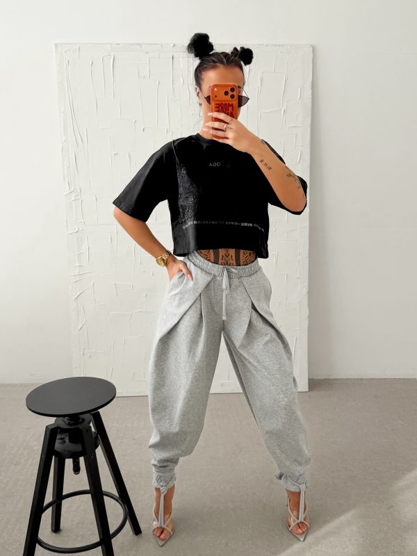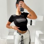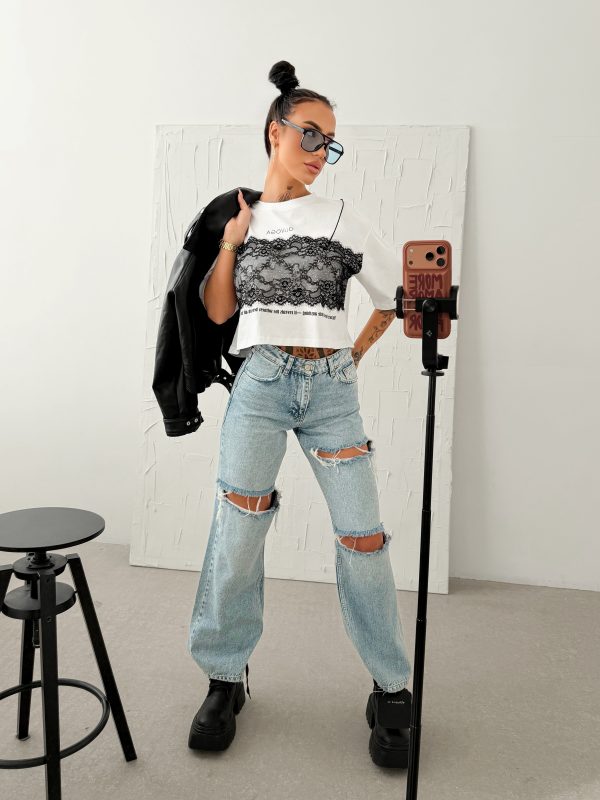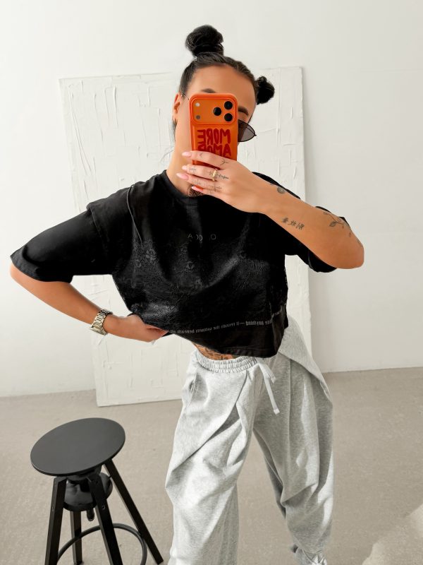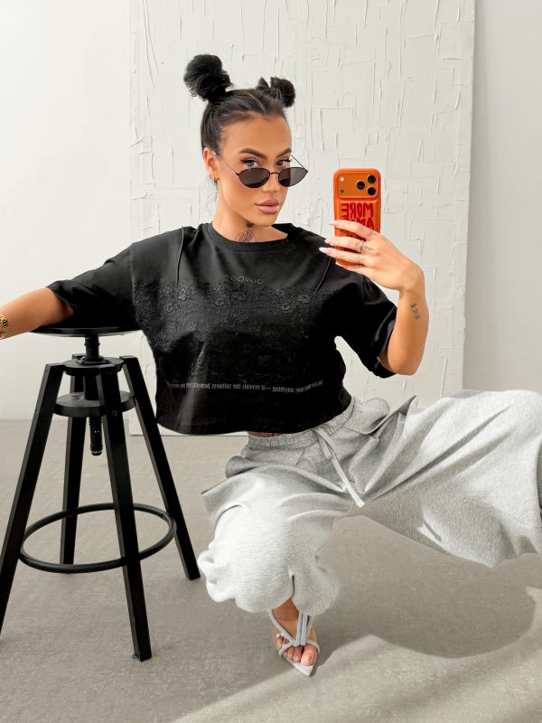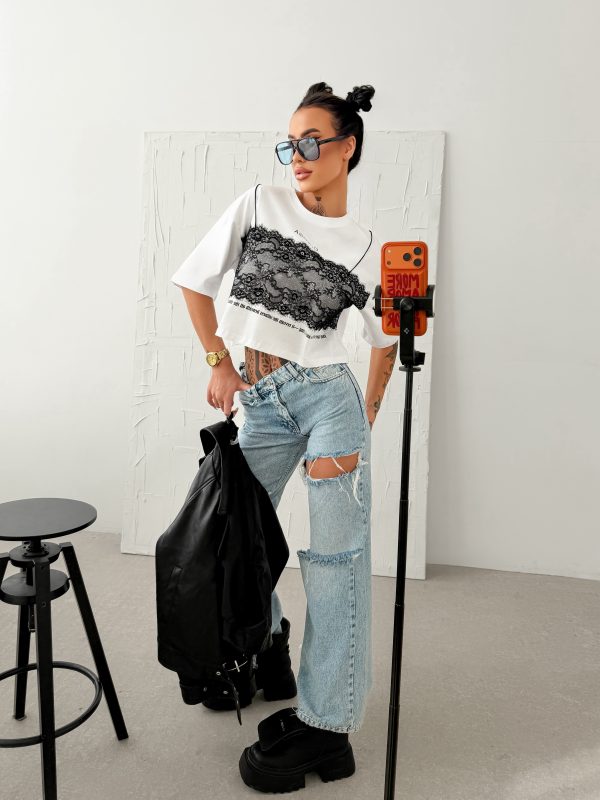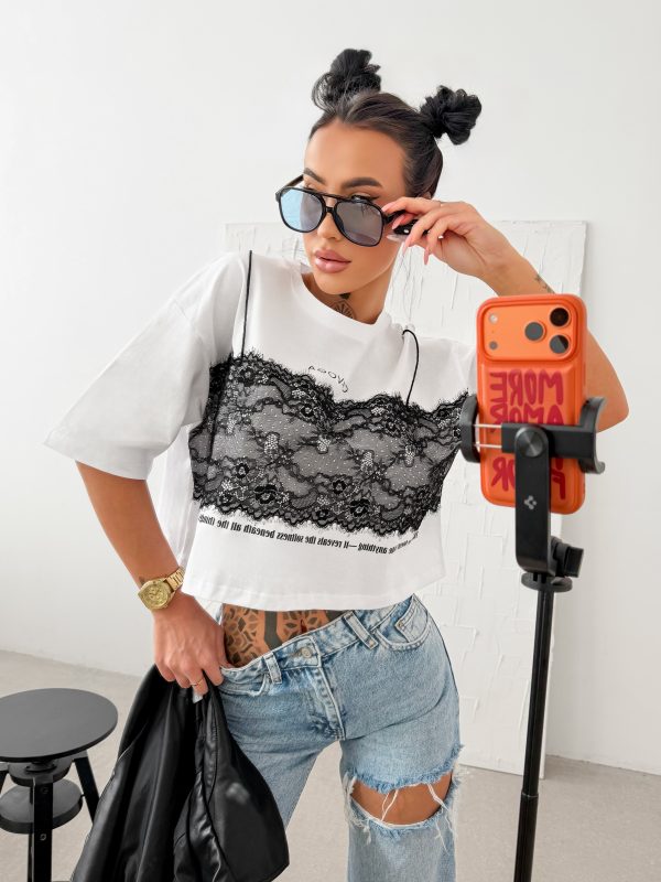 Krój boxy – krótszy krój – okrągły dekolt – krótki rękaw – z przodu kontrastowa aplikacja z koronki tworząca efekt bieliźnianej warstwy – nadruk z logo i inspirującym hasłem