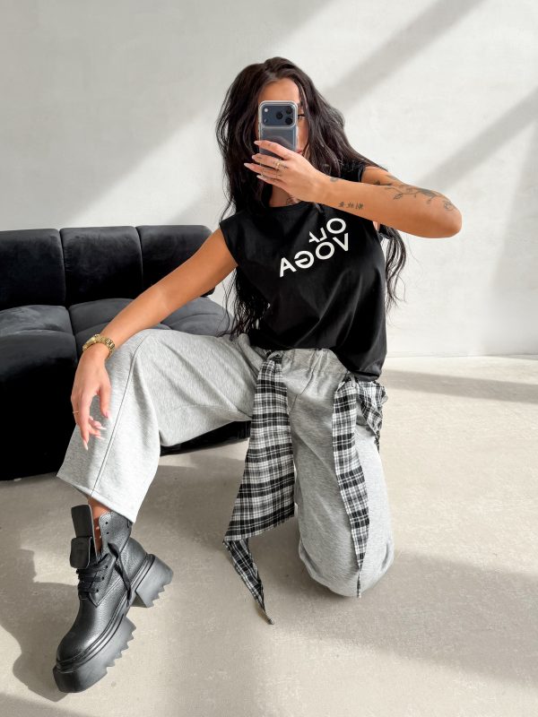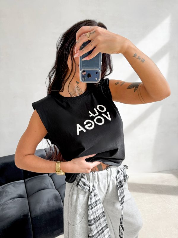 Luźny krój – wysokogatunkowa dzianina – model bez rękawów – wszyte poduszki na ramionach – okrągły dekolt – kontrastowy nadruk z logo na przodzie